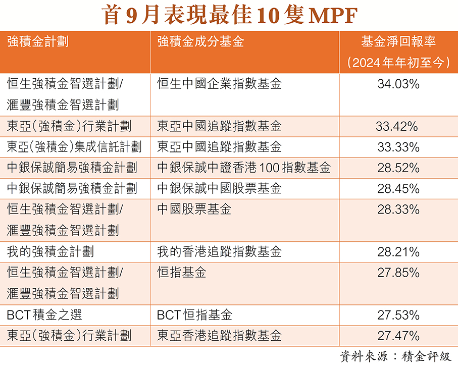 積金評級昨日發布的9月份強積金表現調查指出,在內地全面刺激經濟措施的推動下,「積金評級所有基金表現指數」9月份升約4.81%,整個第三季上升約7.24%,為自2022年第四季以來的最佳季度表現,今年迄今升幅達12.77%,為2017年以來的最佳首9個月表現,也是有紀錄以來的第四個最佳首9個月表現。