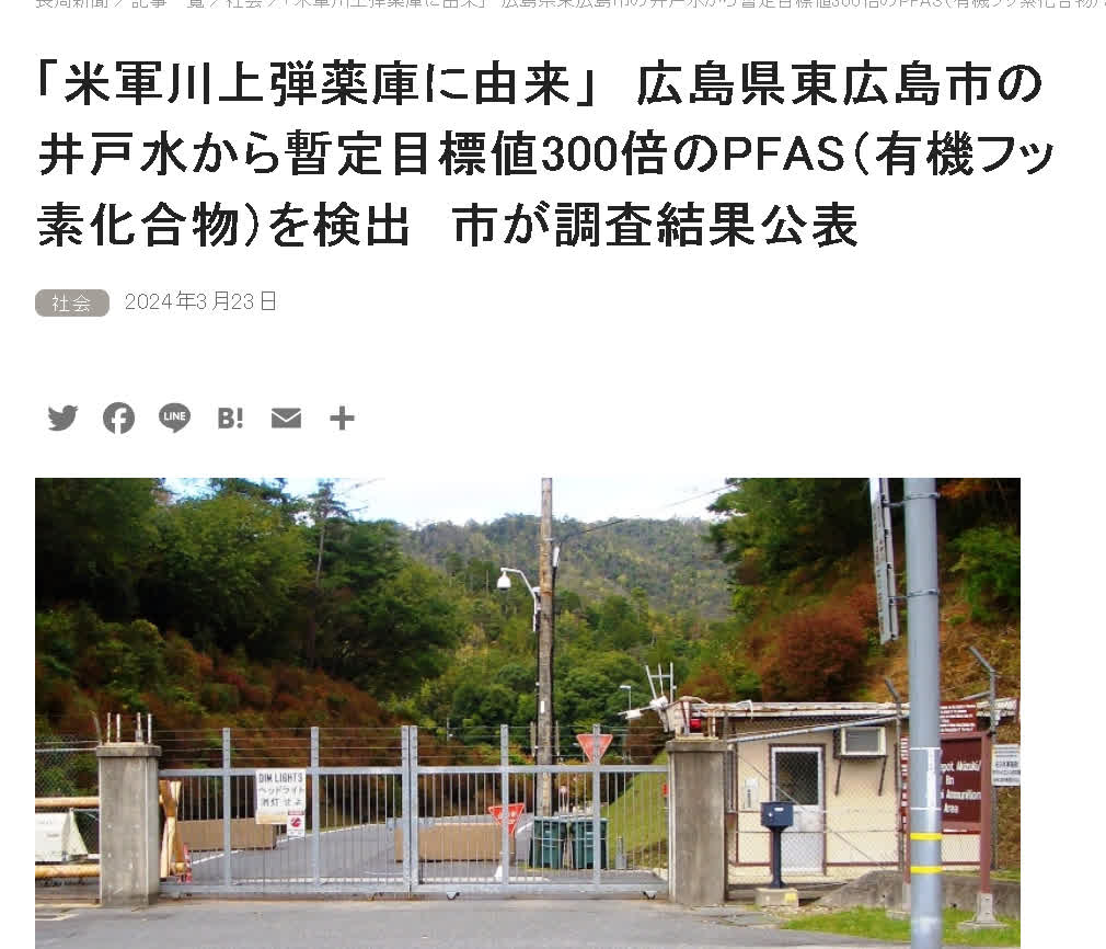 雖然PFAS的污染問題是一個全球各國都在面對的問題,但日本東廣島市的情況卻很特殊。因為,在經過數月的調查後,東廣島市政府發現造成當地水體被PFAS物質污染的源頭,竟源自於該市西部的駐日美軍的一個彈藥庫:川上彈藥庫。