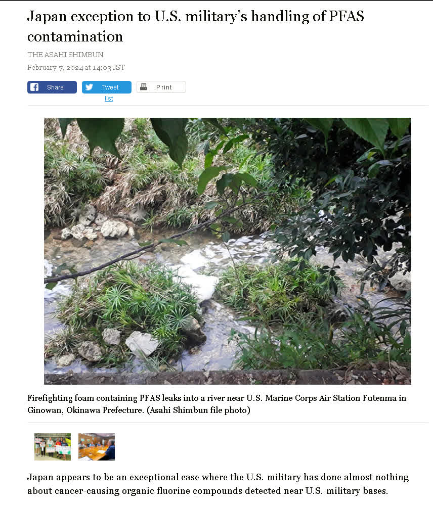 今年2月,日本《朝日新聞》就披露說,一直飽受美軍基地侵擾的沖繩民眾,也面臨着他們的生存環境被來自美軍基地的PFAS物質污染的問題——而且沖繩美軍基地對當地水體的PFAS物質污染問題,是早在2016年時就出現的。