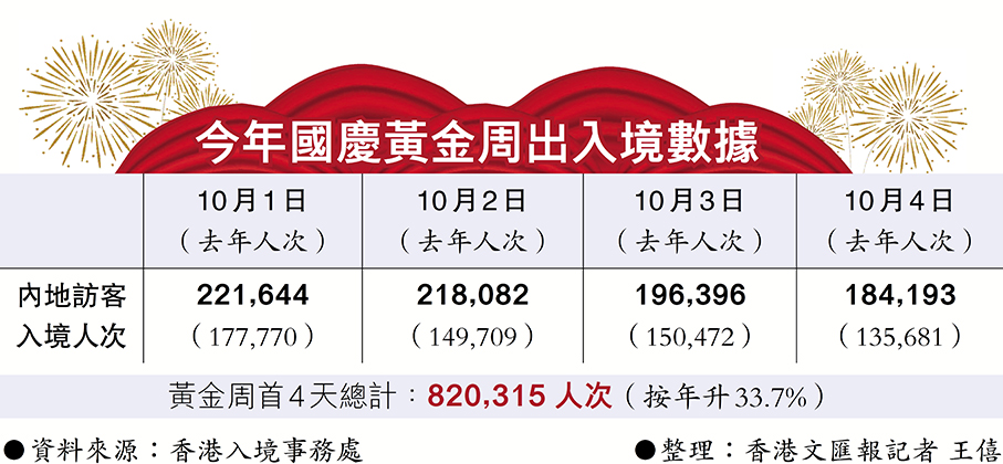 (香港文匯報記者 張弦)為期7天的內地國慶黃金周假期已過半,首4天有超過82萬人次內地旅客訪港,按年增33.7%,業界相信整個黃金周赴港內地旅客能突破100萬大關,遠超預期。在旅客帶動下,昨日尖沙咀、旺角等旅遊熱點的人流絡繹不絕,氣氛熾熱。有小商戶表示國慶首幾天假期,小食賣斷市、丁財兩旺,冀特區政府能舉辦更多歌舞等表演吸引旅客訪港。高端商品亦大收旺場,廣東道名店外長期排滿輪候入場的旅客,人龍延綿百多米。有旅客表示,香港的旅遊景點多元化,有時尚、文創、生態、懷舊等不同選擇,但希望香港能提高免稅額,讓他們買得盡興,「一個名牌包包(售價)都幾萬元了,可不可以再高一點?」