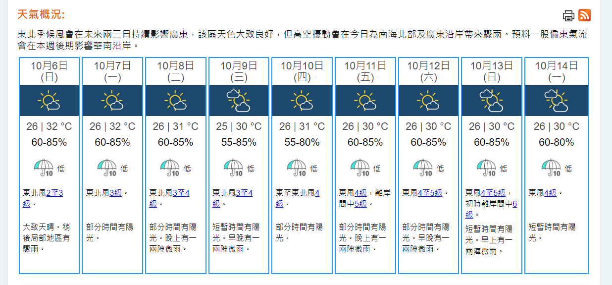 大公文匯全媒體報道,今日(6日)早上9時30分,天文台錄得氣溫28.9度,相對濕度65%。一股東北季候風正為廣東沿岸帶來大致良好天氣。此外,與高空擾動相關的驟雨正影響南海北部。本港地區今日天氣預測大致天晴,日間炎熱,市區最高氣溫約32度,新界再高一兩度。稍後局部地區有驟雨。吹輕微至和緩東北風。未來數日部分時間有陽光。