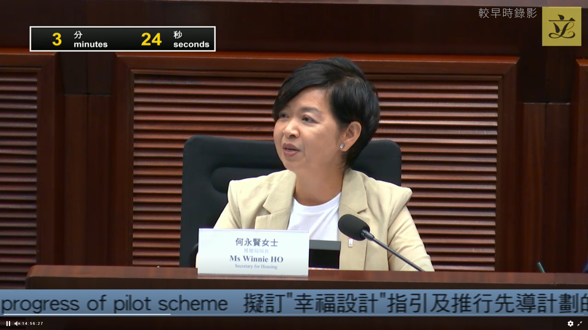 何永賢回應表示,在進行「共築·幸福」計劃時,一定會掌握「小工程,大意義」的方向,雖然幸福設計指引當中的建議,並非大規模工程,但當中的心思是希望做到便民暖心。她提到在2026/27年度起,資助房屋的單位面積會封底,不會少於26平方米。至於公屋方面,未來如果土地充足,單位面積必然會改善,但眼前由於要大量興建,因此數量較重要。