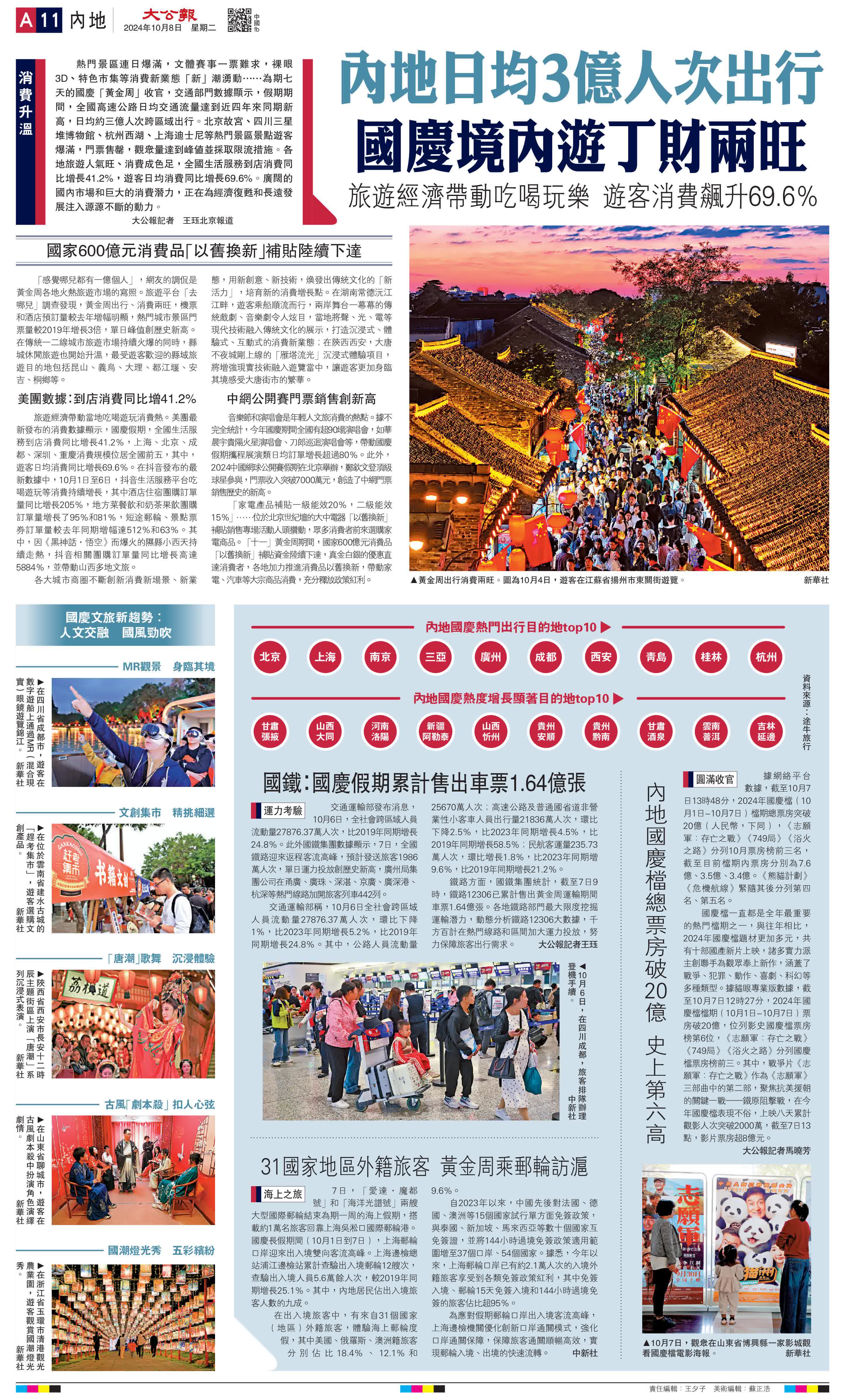(大公報記者 王珏北 京報道)熱門景區連日爆滿,文體賽事一票難求,裸眼3D、特色市集等消費新業態「新」潮湧動……為期七天的國慶「黃金周」收官,交通部門數據顯示,假期期間,全國高速公路日均交通流量達到近四年來同期新高,日均約三億人次跨區域出行。北京故宮、四川三星堆博物館、杭州西湖、上海迪士尼等熱門景區景點遊客爆滿,門票售罄,觀眾量達到峰值並採取限流措施。各地旅遊人氣旺、消費成色足,全國生活服務到店消費同比增長41.2%,遊客日均消費同比增長69.6%。廣闊的國內市場和巨大的消費潛力,正在為經濟復甦和長遠發展注入源源不斷的動力。