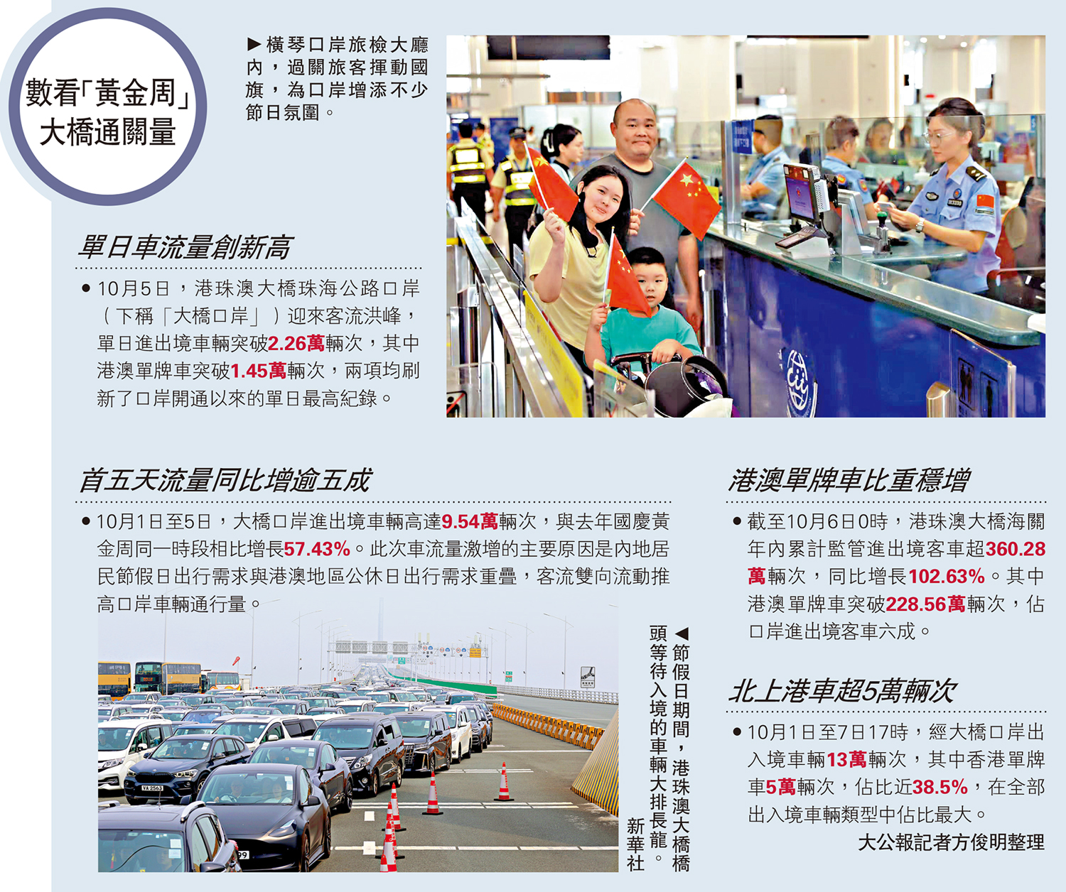 (大公報 記者 方俊明)10月7日,記者從港珠澳大橋邊檢站獲悉,10月1日至7日17時經港珠澳大橋珠海公路口岸出入境車輛總數13萬輛次,其中香港單牌車達5萬輛次,佔比近38.5%,在全部出入境車輛類型中佔比最大。此外,10月5日當天單日進出境車輛突破2.26萬輛次,其中,港澳單牌車突破1.45萬輛次,兩項均刷新了口岸開通以來的單日最高紀錄。而黃金周前五天港澳單牌車的出入境總量同比大增73%。