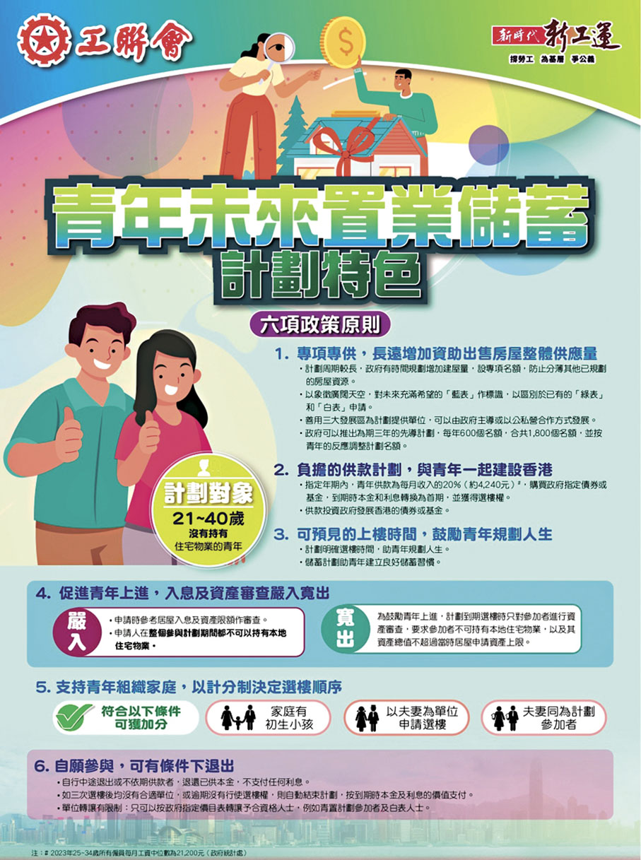 工聯會立法會議員鄧家彪介紹計劃指,申請者在指定年期內購買政府指定債券或基金,供款額則參考全港25歲至34歲僱員的工資中位數的兩成、即每月最低供款約4,240元。計劃到期時,本金和利息轉換為首期,參加者並獲資助出售房屋揀樓權,從開始供款到正式選樓有較長的年期,例如8年,專項單位亦建議分布於三大發展區內,包括北部都會區、將軍澳和交椅洲人工島,「在有新的發展、新的土地下推行新計劃,避免社會矛盾。」