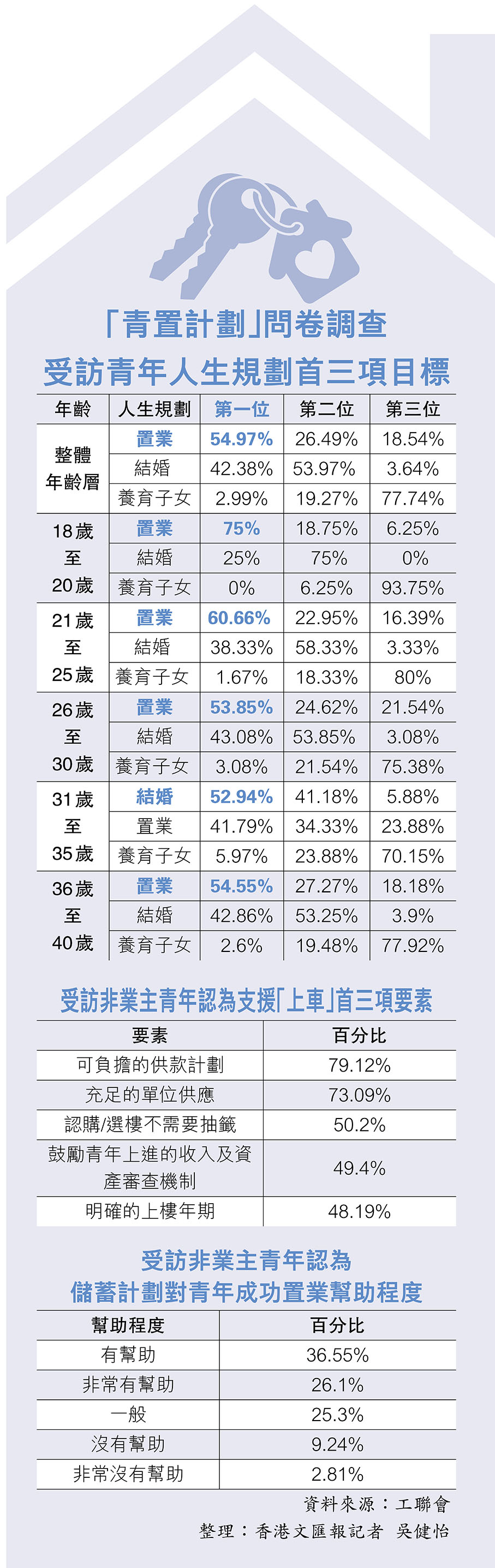 她又引述調查發現,受訪青年的理想人生大事,順序為置業、結婚、養育子女,顯示置業為青年的人生第一大事。