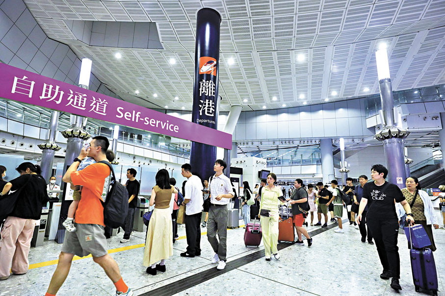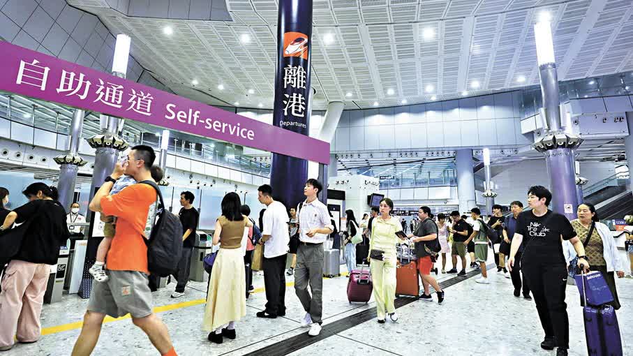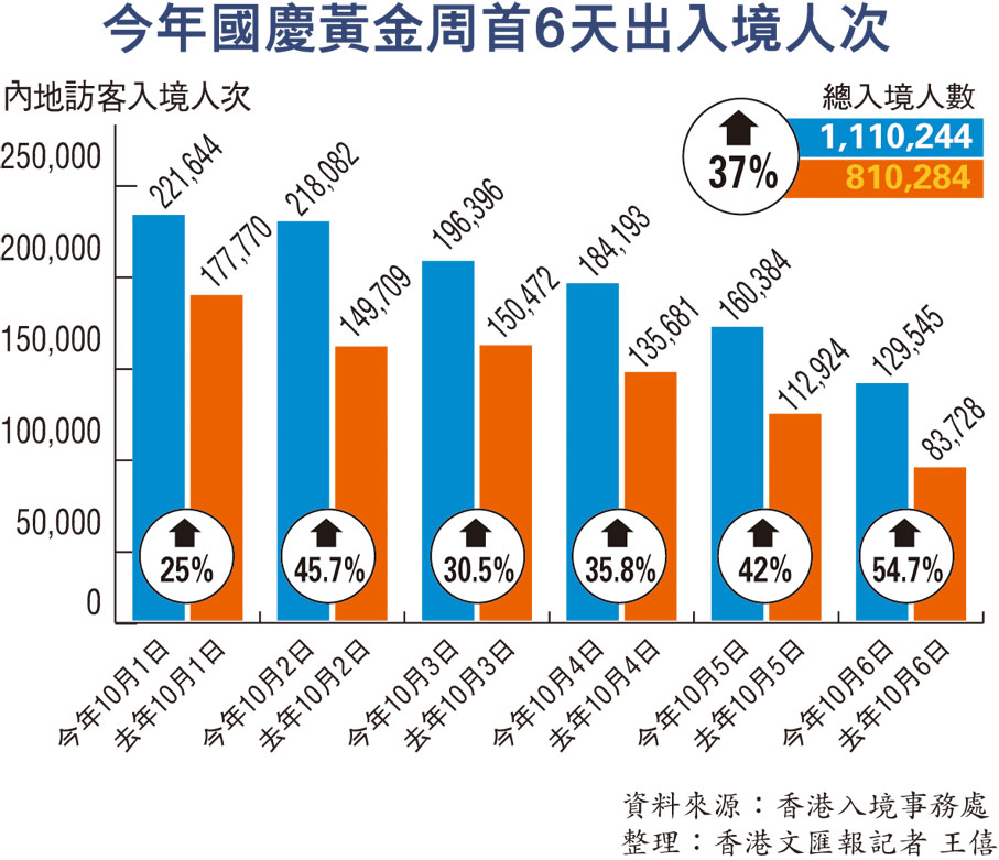 昨日(7日)是內地國慶黃金周假期最後一天,特區政府節慶安排跨部門工作小組表示,截至當晚9時,昨日出入境人次總計為69.8萬多人次,其中32.5萬多人次入境,37.3萬多人次出境。
