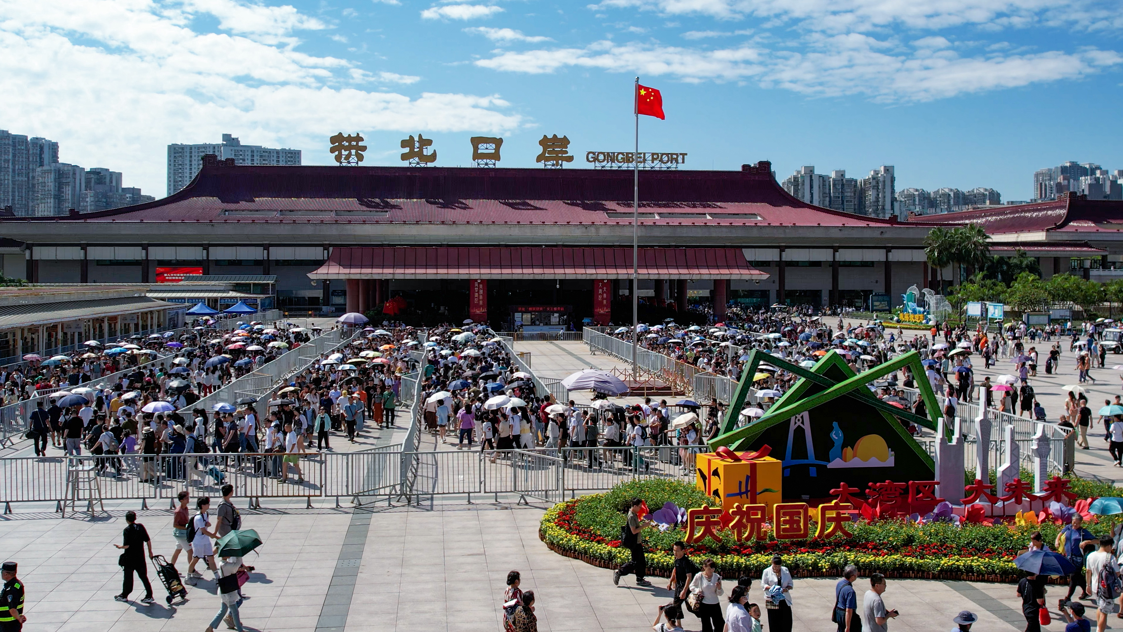 與澳門緊密相連的拱北口岸和青茂口岸,假期出入境人員數量達到248.8萬人次和73.5萬人次,分別同比增長20.4%和7.9%,其中拱北口岸國慶假期客流查驗總量位居全國各口岸之首。