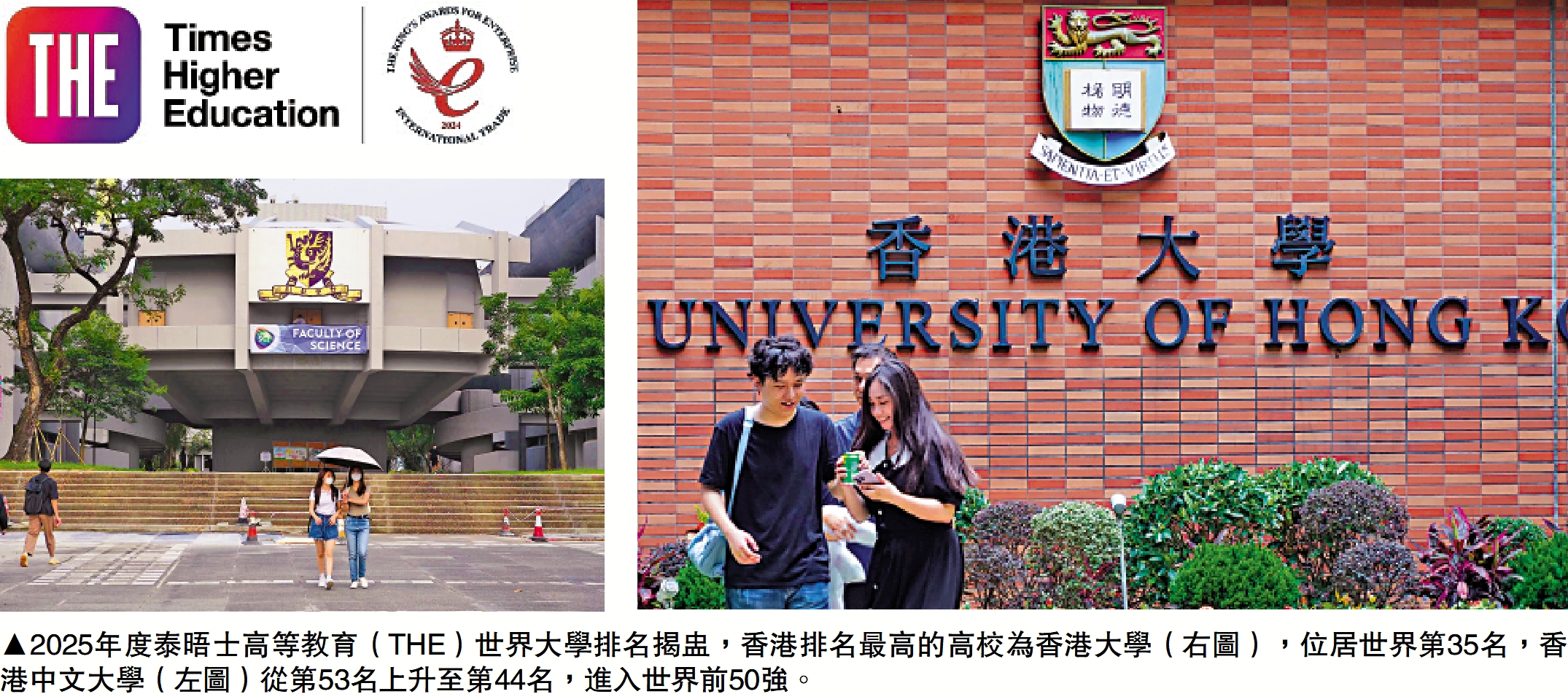 (大公報 記者 郭如佳)2025年度泰晤士高等教育(THE)世界大學排名揭盅,香港排名最高的香港大學,穩居世界第35名,香港中文大學從世界排名第53名上升至第44名,進入世界前50強。內地高校的排名亦穩步上升,其中清華大學以世界第12名的成績,連續第七年穩居內地高校之首;浙江大學則首次進入全球前50名。