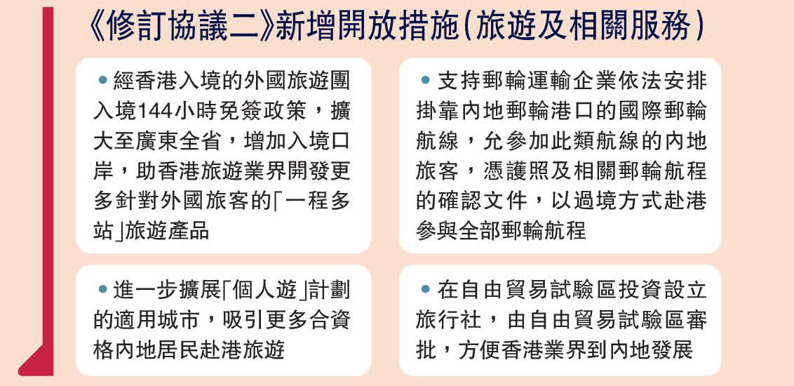 (大公報 記者 鍾佩欣)修訂《〈內地與香港關於建立更緊密經貿關係的安排〉服務貿易協議》的協議惠及本港旅遊服務業,旅議會主席徐王美倫接受《大公報》訪問時表示,協議反映出中央對香港的關愛。香港旅遊服務業應抓緊機遇,積極主動改革,更好發揮自身優勢。新CEPA下的簽證便利吸引更多國內及國外郵輪客人以香港作為中轉站,形成更大誘因吸引郵輪公司選擇香港作為母港。
