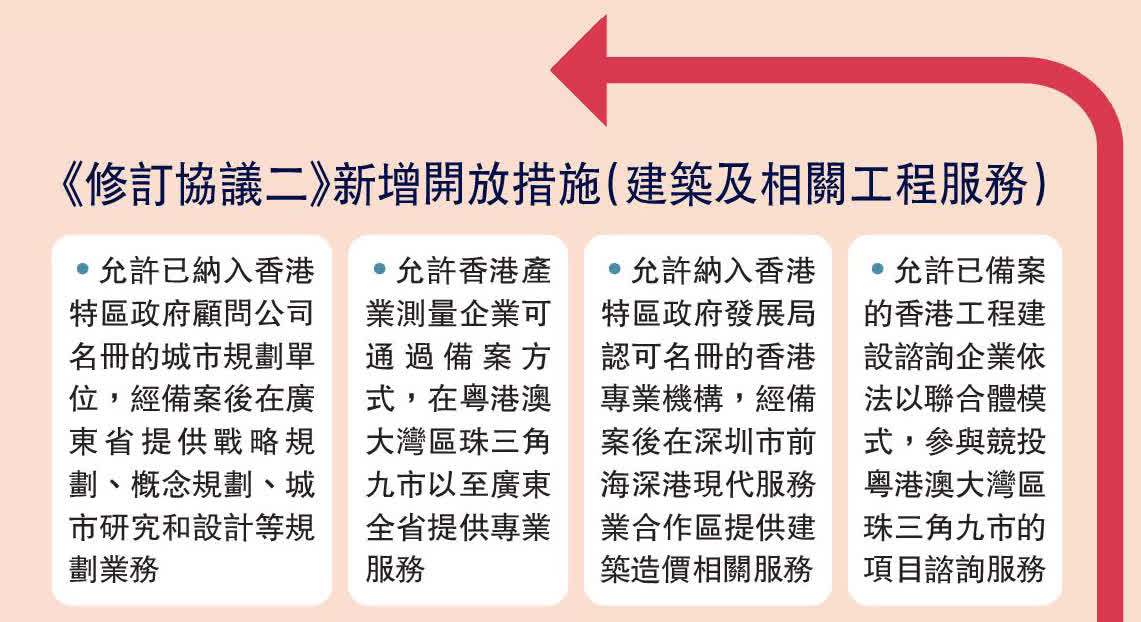 (大公報 記者 義昊)《修訂協議二》在不少香港特別具優勢的服務領域增添開放措施,在建築及相關工程服務方面,允許香港產業測量企業可通過備案方式,在廣東省提供專業服務;以及允許已備案的香港工程建設諮詢企業依法以聯合體模式參與競投粵港澳大灣區珠三角九市的項目諮詢服務。