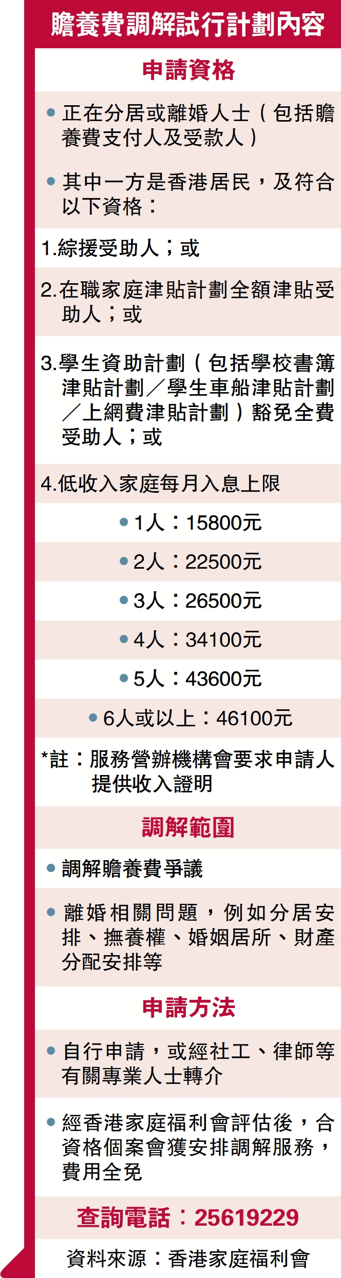行政長官李家超在去年施政報告宣布推出贍養費調解試行計劃,協助與事雙方就有關事項,以更便捷的調解方式解決爭議。民青局表示,已委託香港家庭福利會作為試行計劃的服務營辦機構,只要涉及贍養費爭議的任何一方為香港居民,並且符合入息限額,雙方均可參與計劃,費用全免。有關做法可鼓勵拖欠贍養費的一方參與調解。
