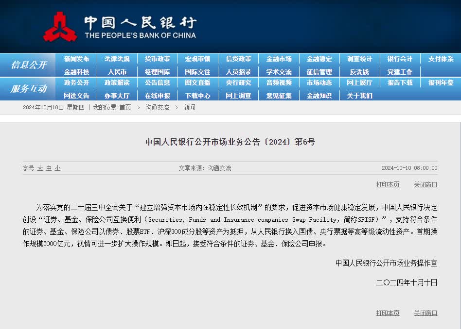 大公文匯網報道,中國人民銀行今日(10日)發布公告,決定創設「證券、基金、保險公司互換便利(Securities,Funds and Insurance companies Swap Facility,簡稱SFISF)」,支持符合條件的證券、基金、保險公司以債券、股票ETF、滬深300成分股等資產為抵押,從人民銀行換入國債、央行票據等高等級流動性資產。首期操作規模5000億元(人民幣),視情可進一步擴大操作規模。即日起,接受符合條件的證券、基金、保險公司申報。