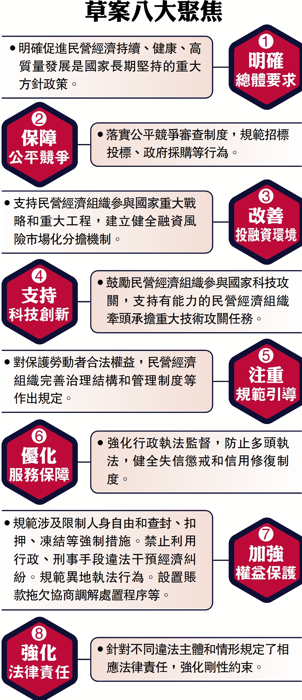 草案明確促進民營經濟發展總體要求,從公平競爭、投資融資、科技創新、規範經營、服務保障、權益保護、法律責任等方面作出規定,營造有利於包括民營經濟在內的各種所有制經濟共同發展的法治環境和社會氛圍。