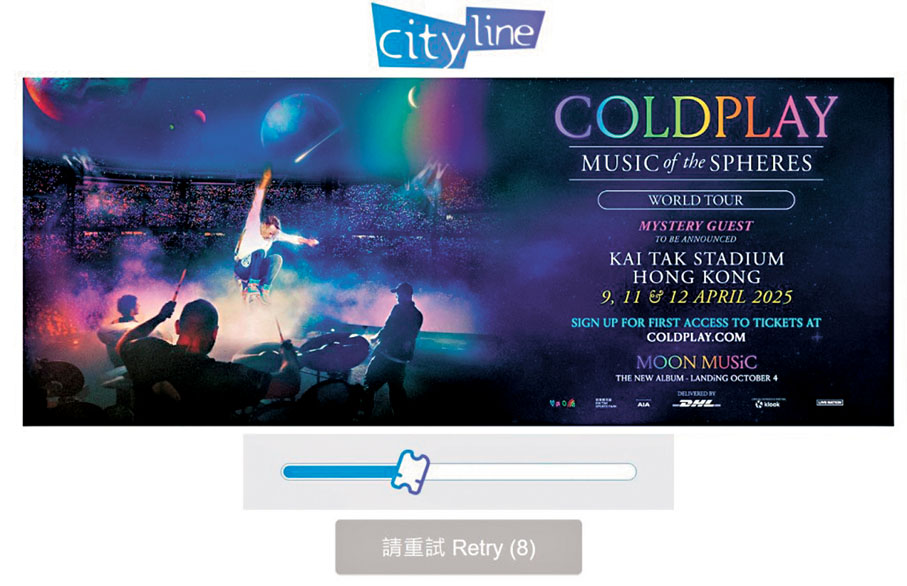 (香港文匯報 記者 文森)被譽為「天團」的英國殿堂級搖滾樂隊Coldplay將來港演出,訂於明年4月9日、11日及12日在啟德體育園舉辦三場演唱會。繼之前數天分階段發售優先票後,昨日上午10時Cityline公開售票,是樂迷最後撲飛機會。昨晨香港文匯報記者準時在網站等候,踏正上午10時點擊「前往購票」按鈕,惟一直未能進入購票系統,記者不斷重試,到11時許系統出現「Sold Out(售罄)」畫面。二手買賣交易平台則採取措施禁止買賣「黃牛飛」,賣家遂私下與買家進行「枱底」交易,炒價較正價高最少兩三倍。
