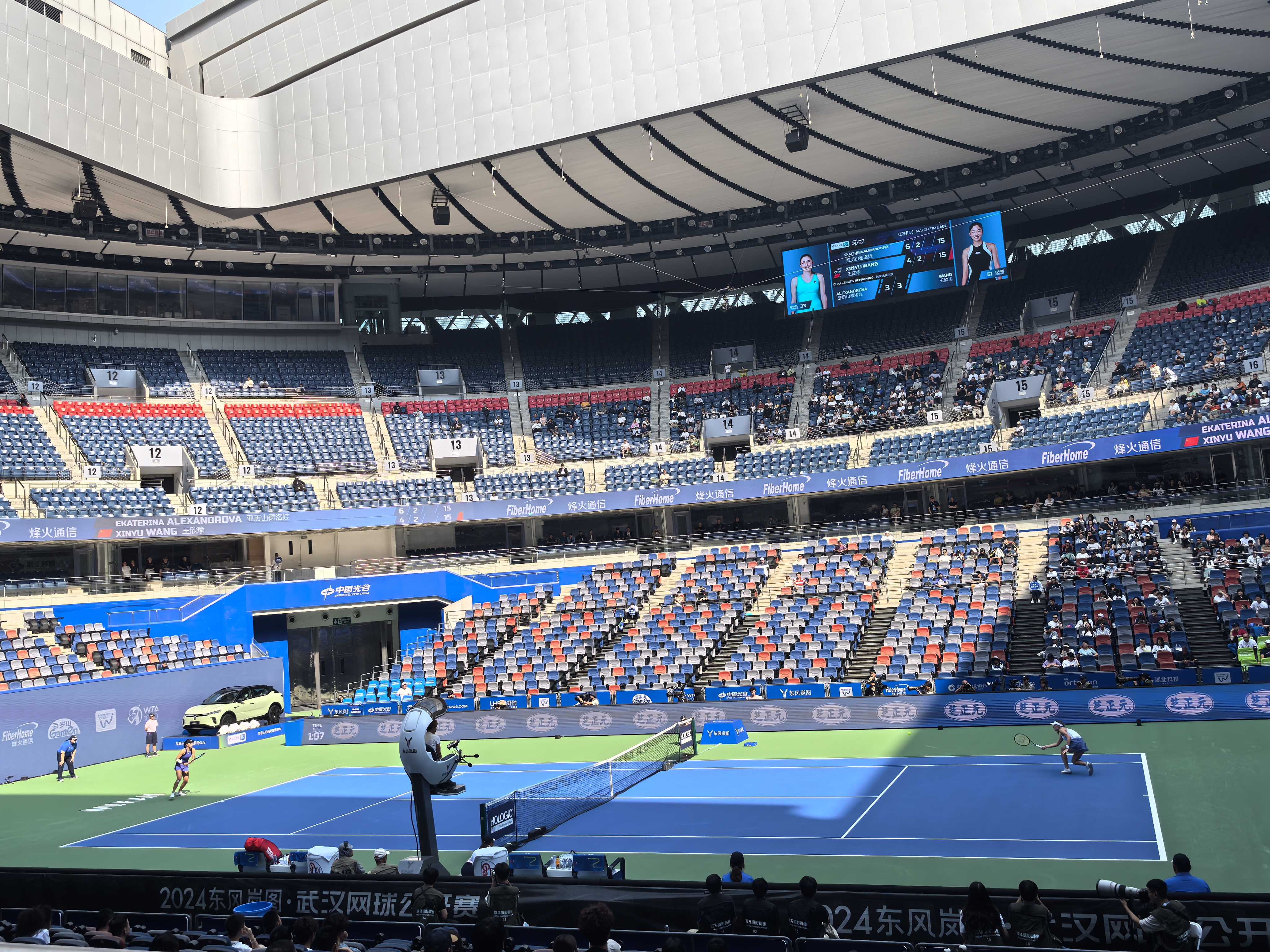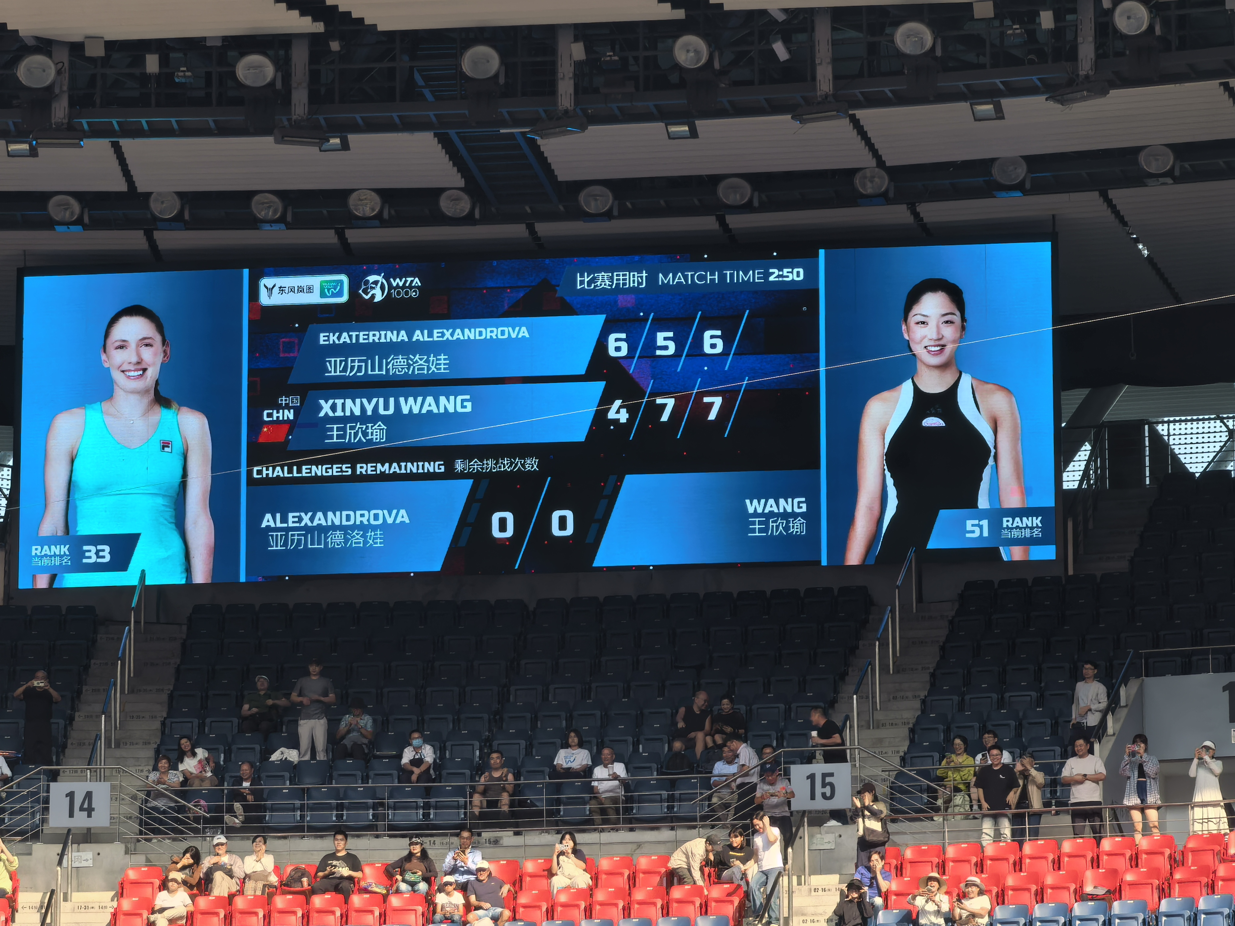 開局,王欣瑜4-6輸掉首盤比賽,第二盤、第三盤王欣瑜狀態神勇,第三盤在搶七大戰中艱難取勝,以7-5和7-6戰勝亞歷山德洛娃,鎖定一個四強席位,職業生涯首次在WTA1000級別賽事中躋身四強。