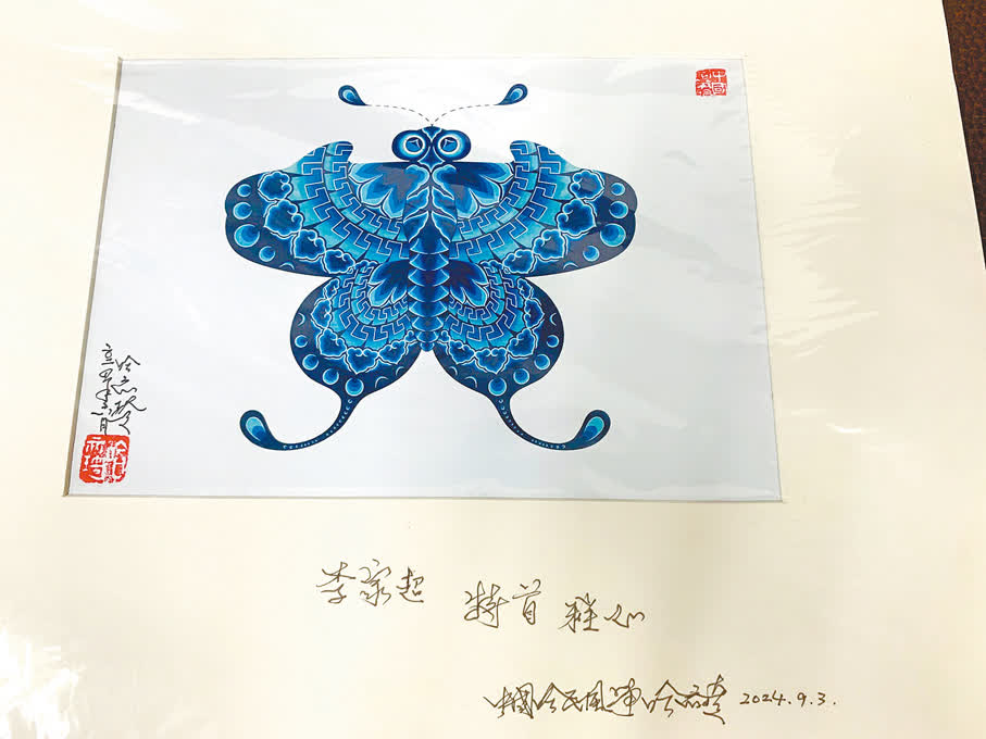 9月底,香港特別行政區行政長官李家超率近三百人赴京出席第27屆京港洽談會。為表達自己對香港由治及興、政通人和的讚嘆,哈亦琦創作了一幅獨一無二的「藍丹蝶」風箏畫譜,希望在京港洽談會期間贈予特首,表達美好祝願。遺憾的是,洽談會未設非遺展示區,哈亦琦特地將「藍丹蝶」託付給大文記者,希望代為轉交。在大會現場,大文記者將這份彌足珍貴的心意轉交予特首辦特別助理黃芷淵代為接收。