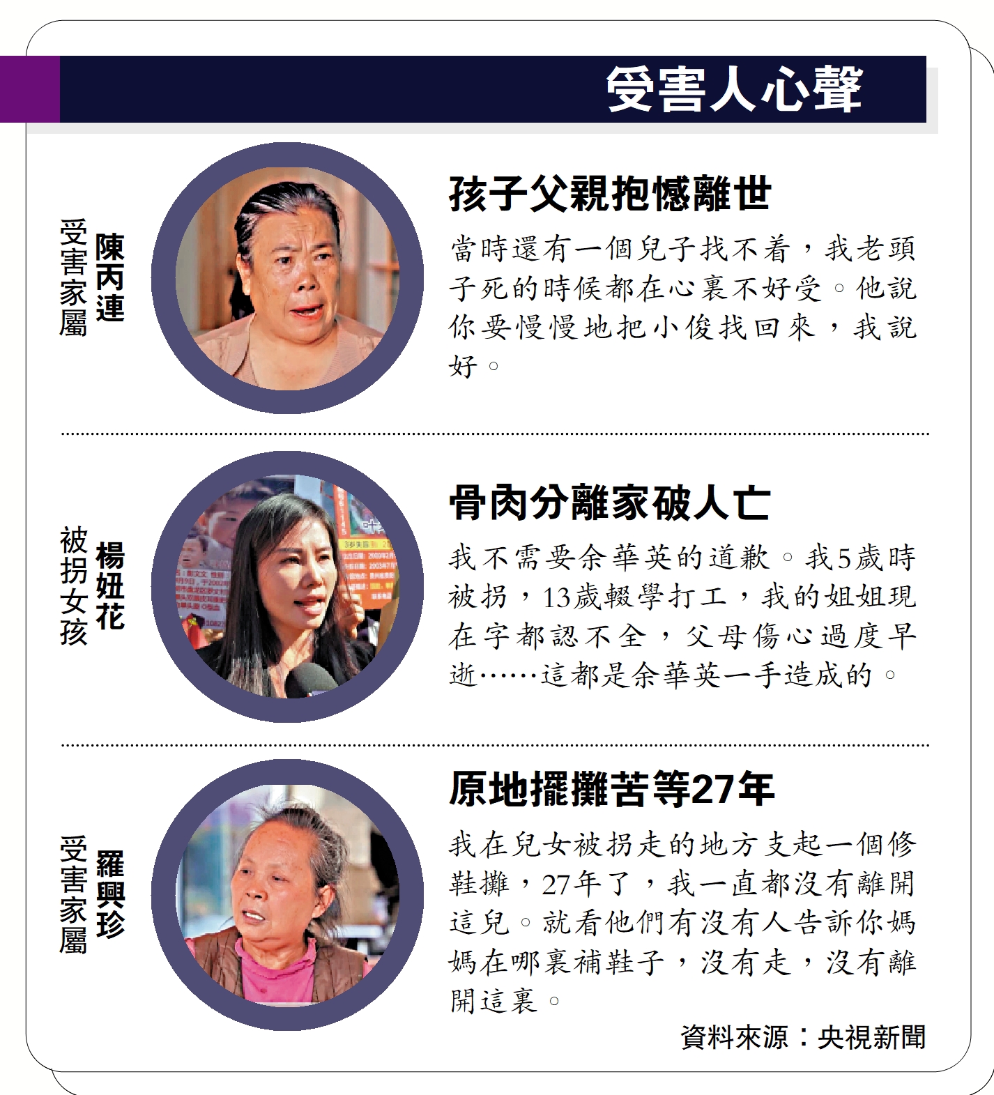楊妞花隨即表示:「我不需要余華英的道歉。我1990年出生,1995年的時候就已經被拐賣到河北邯鄲,我13歲輟學打工,我的姐姐現在字都認不全……,這都是余華英一手造成的。能不能把我父母的生命還給我?所以我懇求一定要嚴判余華英,還我和我們台下所有受害家庭一個公道。」