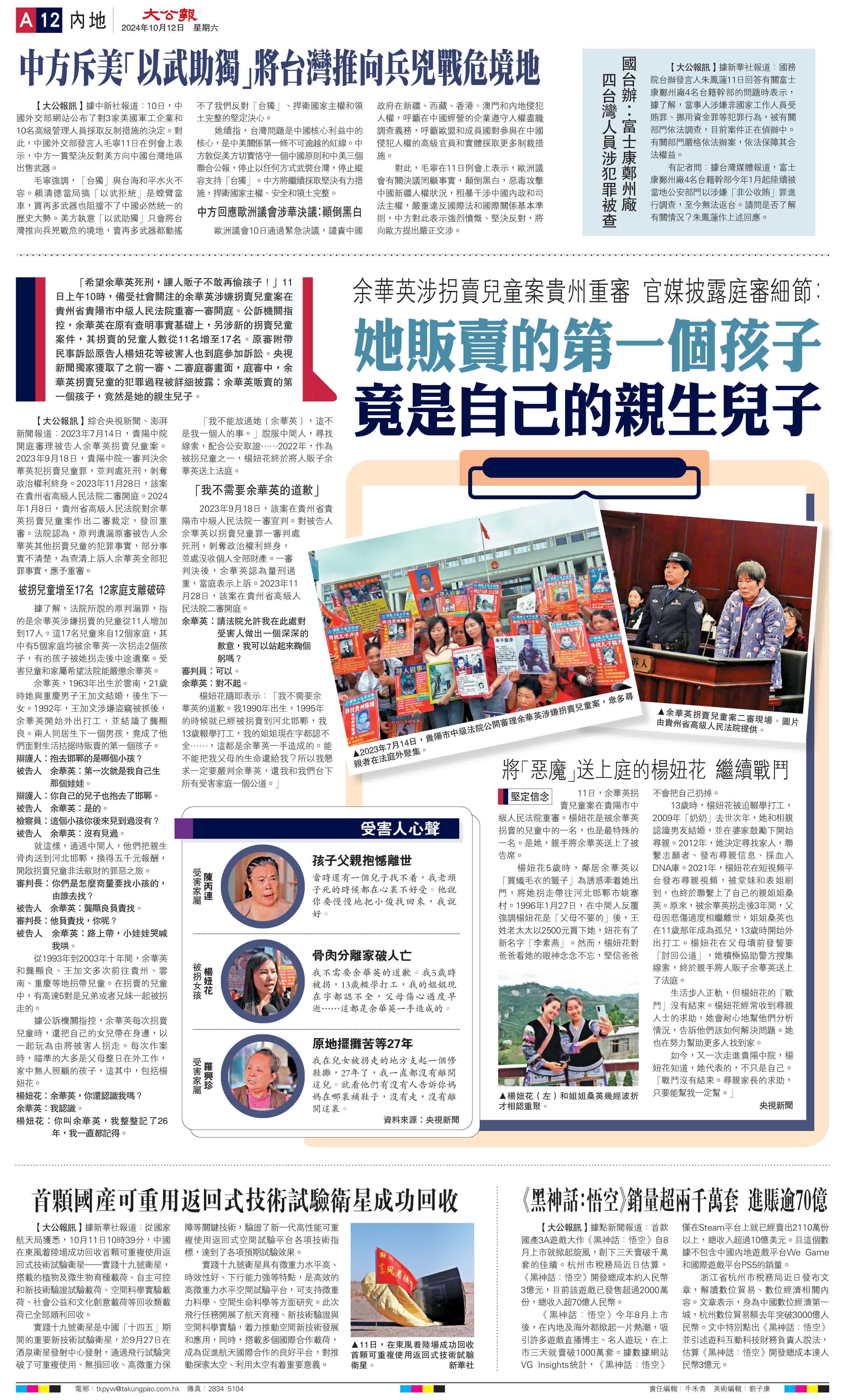 「希望余華英死刑,讓人販子不敢再偷孩子!」11日上午10時,備受社會關注的余華英涉嫌拐賣兒童案在貴州省貴陽市中級人民法院重審一審開庭。公訴機關指控,余華英在原有查明事實基礎上,另涉新的拐賣兒童案件,其拐賣的兒童人數從11名增至17名。原審附帶民事訴訟原告人楊妞花等被害人也到庭參加訴訟。央視新聞獨家獲取了之前一審、二審庭審畫面,庭審中,余華英拐賣兒童的犯罪過程被詳細披露:余華英販賣的第一個孩子,竟然是她的親生兒子。