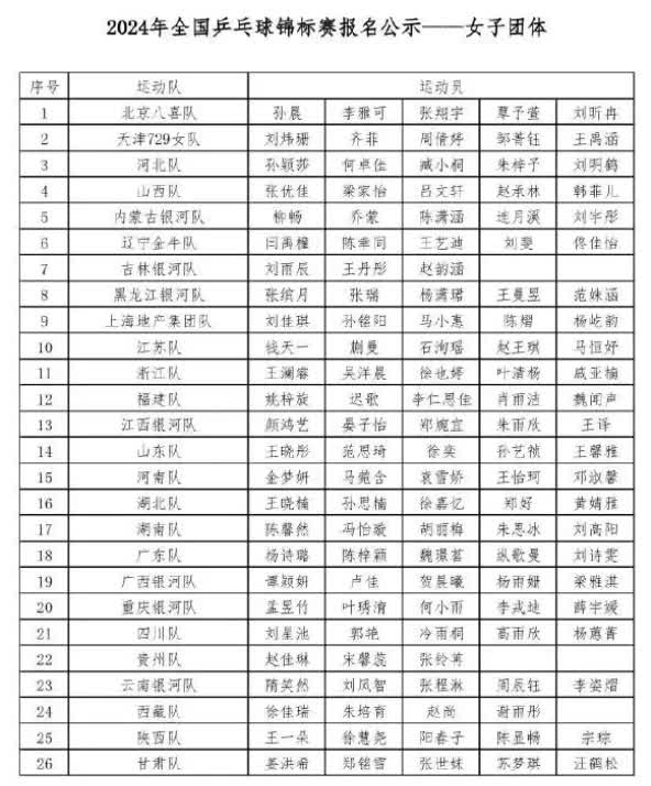 江蘇隊:作為上屆全錦賽女團冠軍,本屆江蘇隊也是派出眾多國家隊主力,包括石洵瑤、錢天一、蒯曼;