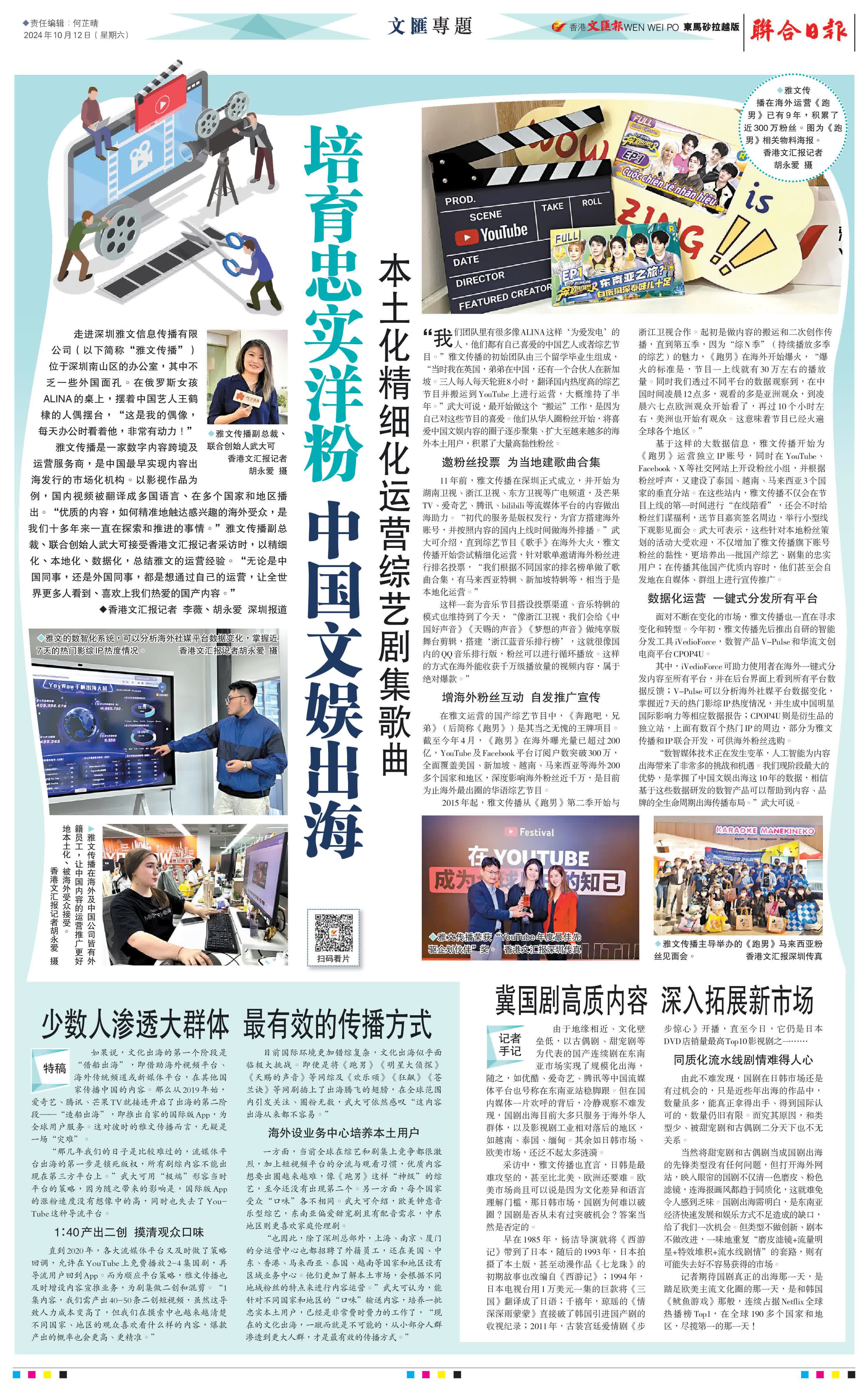 10月12日,《京華中原》《聯合日報》等多家海外華媒聚焦一家數字內容跨境及運營服務商、內地最早實現內容出海發行的市場化機構——圳雅文信息傳播有限公司,關注其十多年來一直在探索和推進如何精準地觸達感興趣的海外受眾,對其本土化、精細化運營綜藝劇集歌曲,將喜愛中國文娛內容的圈子逐步聚集、擴大至越來越多的海外本土用戶,積累大量高黏性粉絲等內容進行了報道。