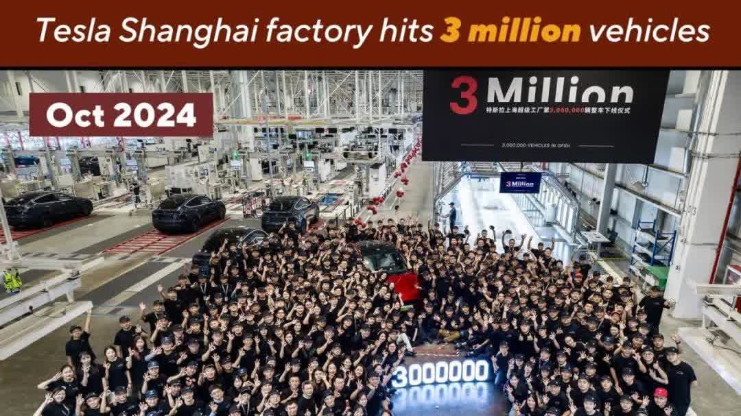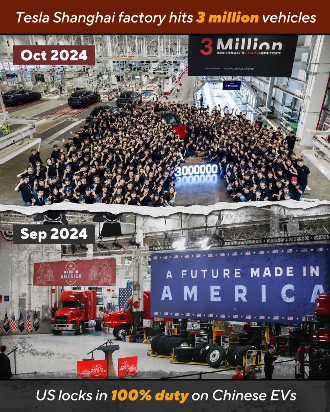 對比圖的上半部分顯示,2024年10月,特斯拉上海超級工廠第300萬輛整車正式下線;圖片下半部分顯示,2024年9月,美國宣布對中國電動汽車徵收100%的關稅。