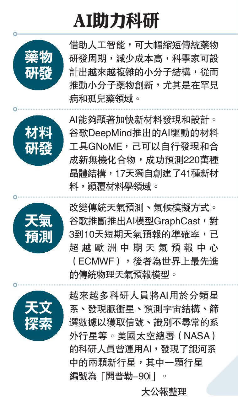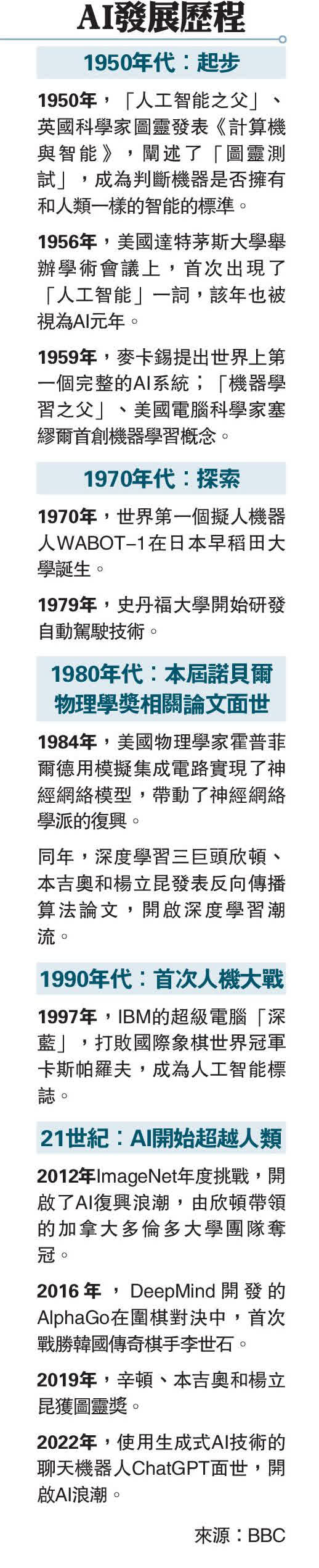 大公報綜合《華爾街日報》、《金融時報》報道:《金融時報》評論稱,人工智能(AI)獲得諾貝爾物理學獎和化學獎青睞,恰好也體現了人工智能的前景和潛在隱患。摘得物理學獎的「AI教父」欣頓多次公開發出AI安全警告,提醒人們未來要更認真地對待AI安全問題,否則AI將對人類構成威脅。