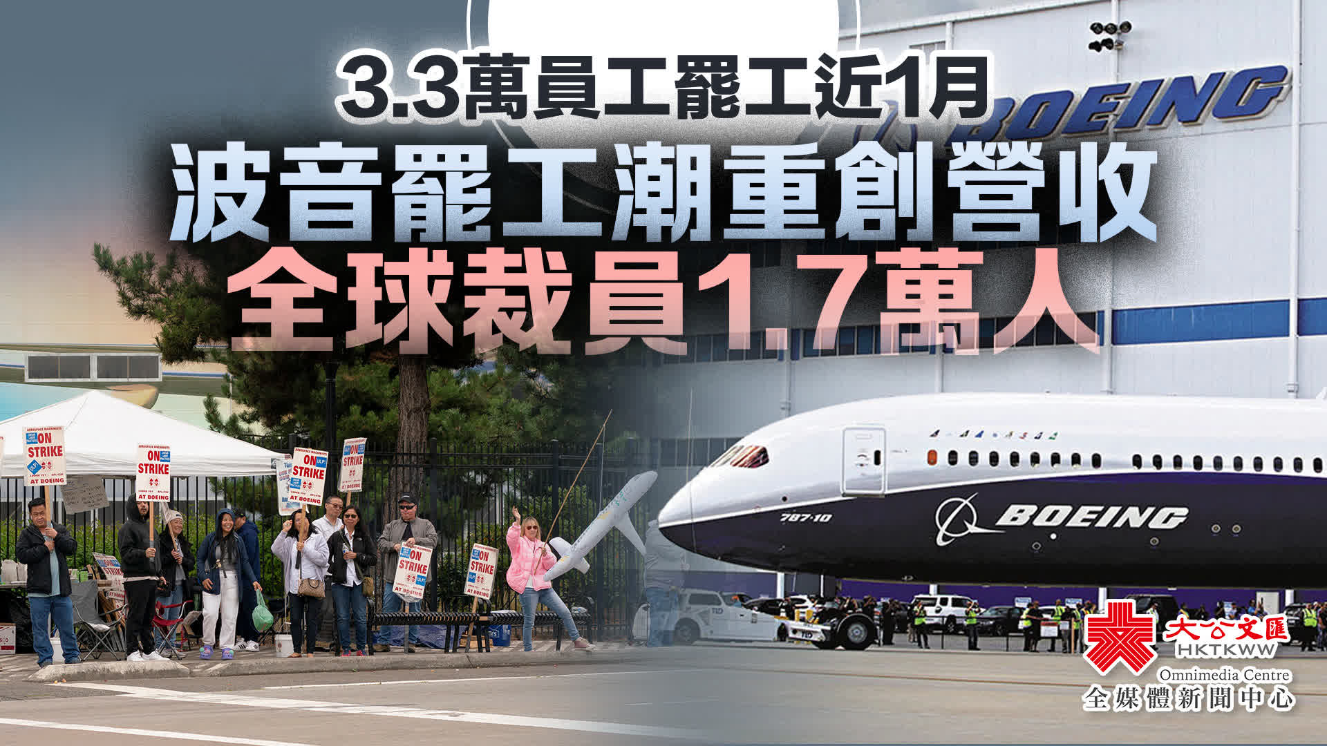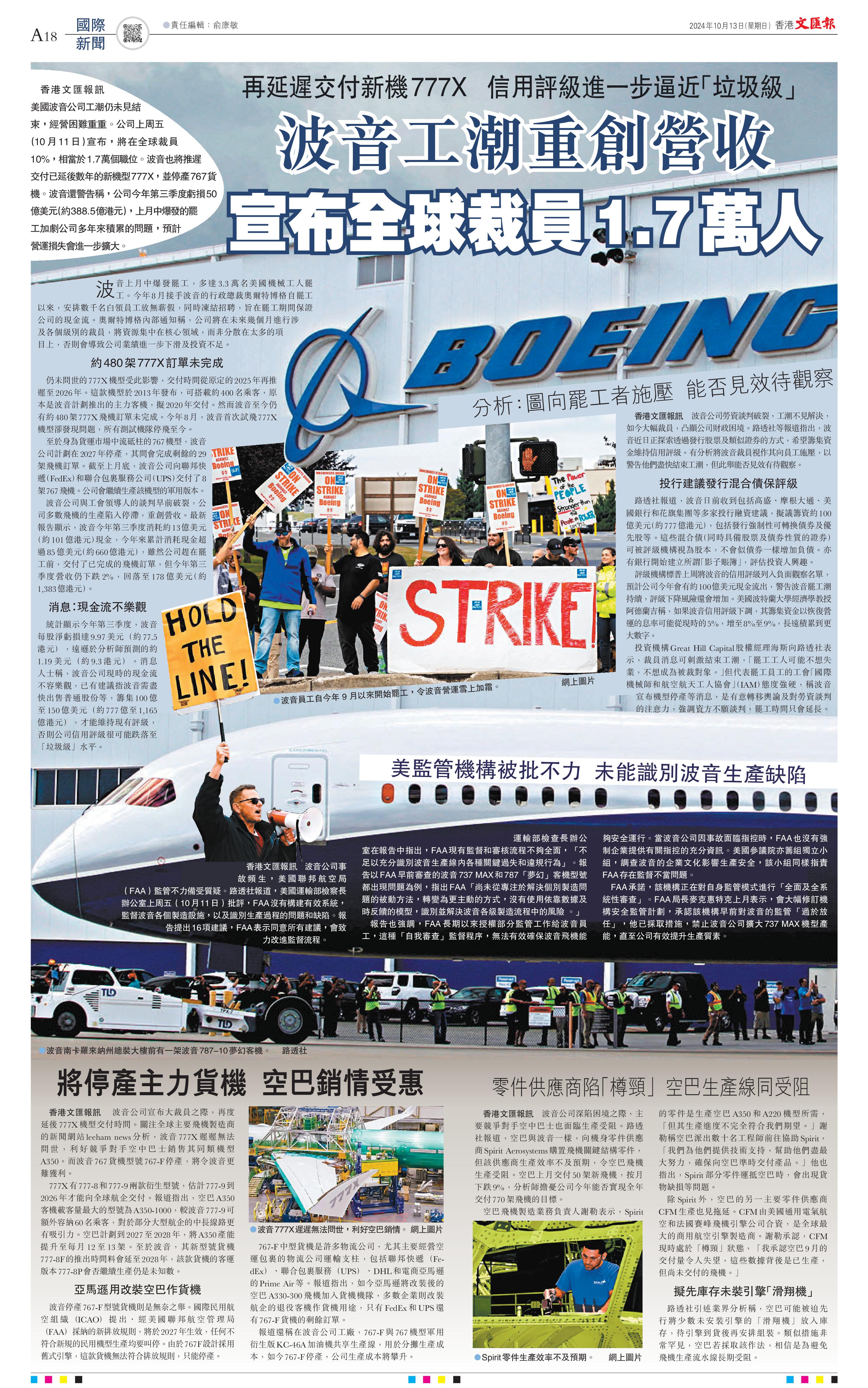 香港文匯報報道,美國波音公司工潮仍未見結束,經營困難重重。公司上周五(10月11日)宣布,將在全球裁員10%,相當於1.7萬個職位。波音也將推遲交付已延後數年的新機型777X,並停產767貨機。波音還警告稱,公司今年第三季度虧損50億美元(約388.5億港元),上月中爆發的罷工加劇公司多年來積累的問題,預計營運損失會進一步擴大。
