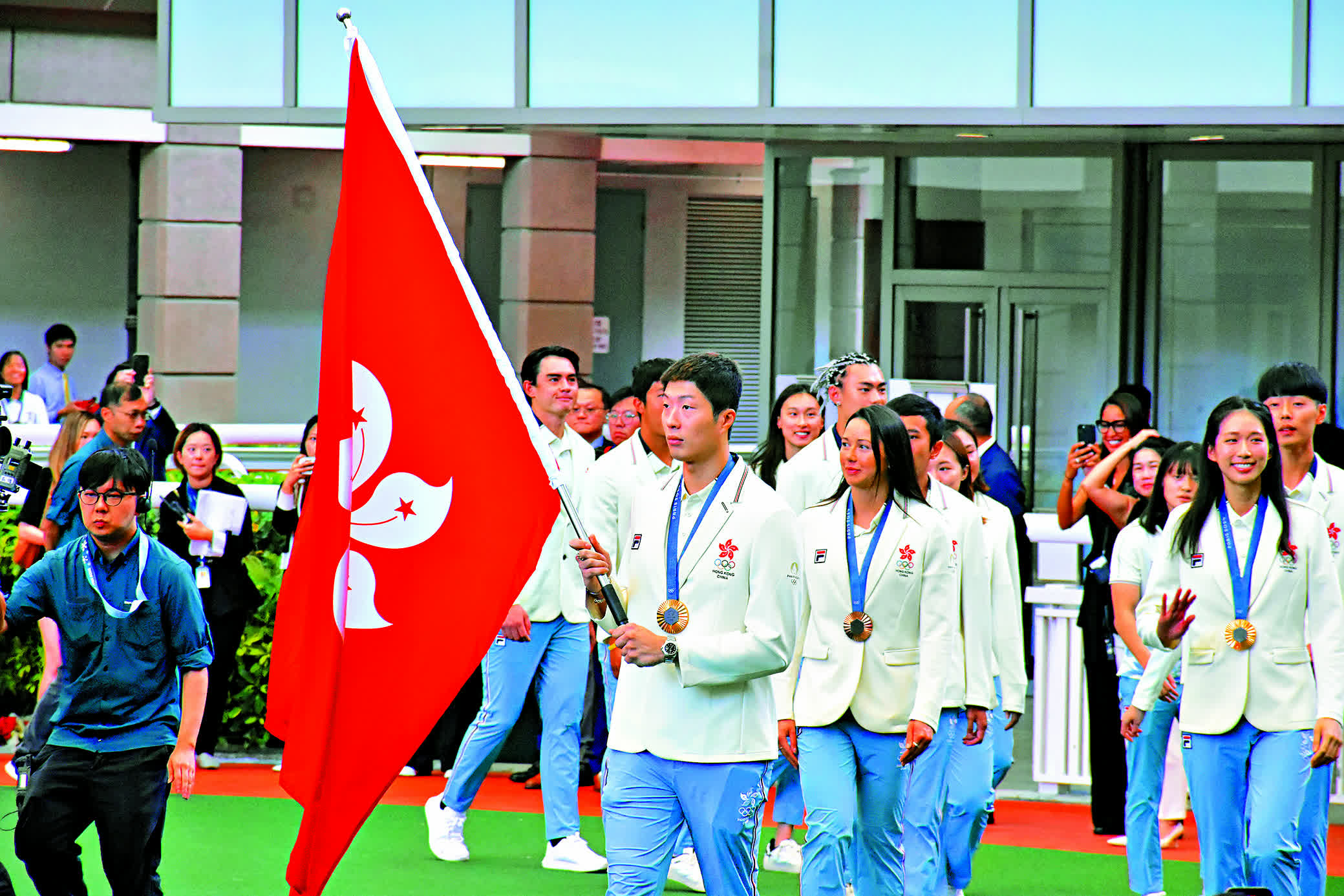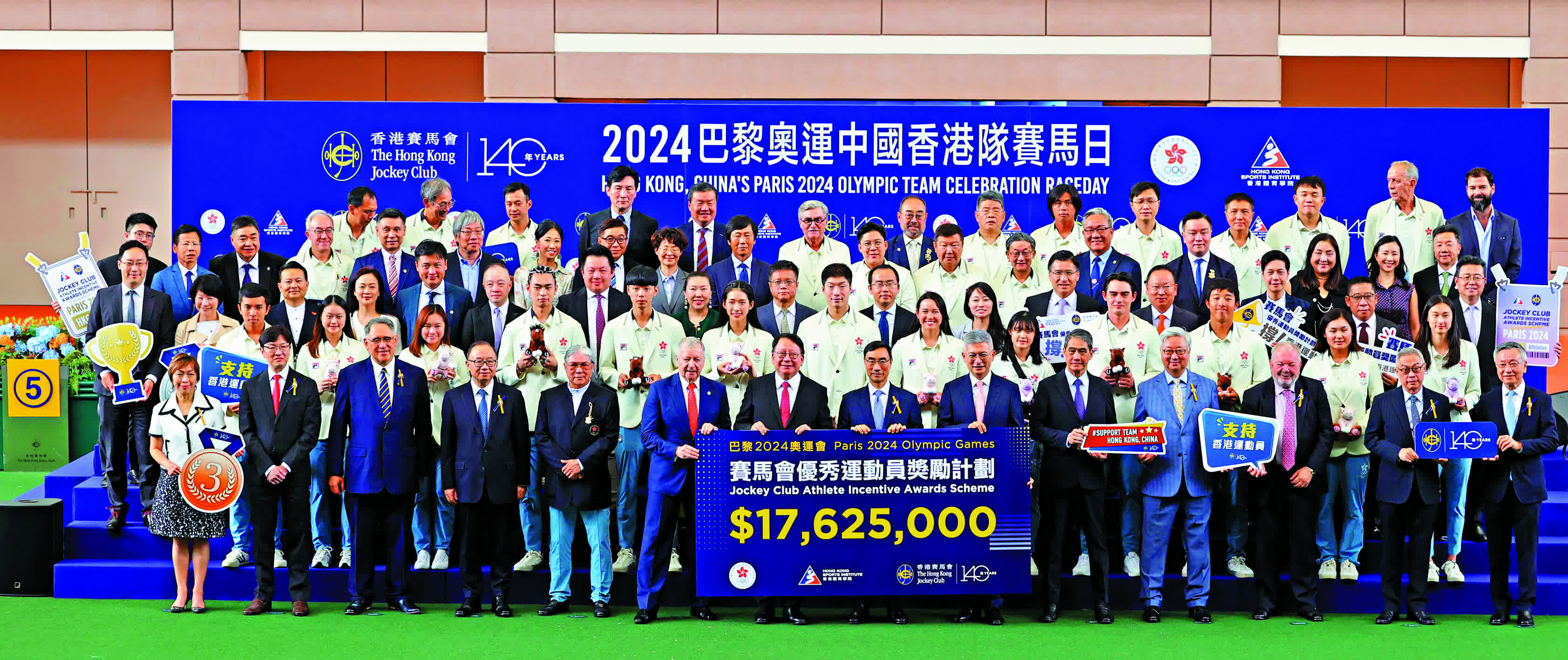 (大公報記者 張銳、朱家立)香港賽馬會昨天在沙田馬場舉行「2024巴黎奧運中國香港隊賽馬日」,以表揚中國香港代表團於本屆巴黎奧運歷史性獲得2金2銅的佳績。賽馬日同場舉行「賽馬會優秀運動員獎勵計劃」支票頒發儀式,向於巴黎奧運取得獎牌及賽事排名第4至第8的運動員頒發合共1762萬5000元獎金。主禮嘉賓、政務司司長陳國基希望社會各界繼續大力支持香港體育發展,讓香港運動員突破自我,在不同比賽場上繼續大放異彩、再攀高峰。