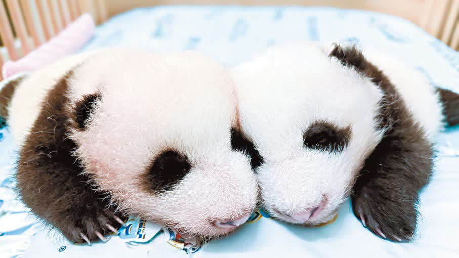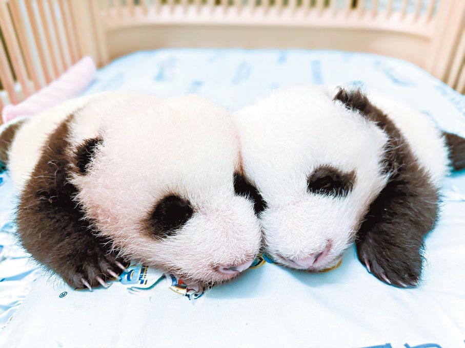香港海洋公園動物及保育主管祝效忠昨日在分享會上表示,一對大熊貓寶寶已於本月初睜開眼睛,長出濃密毛髮,不需再放在保溫箱內。牠們現時已可在嬰兒床上四周爬動探索世界,而姊姊及弟弟現時分別重2.7公斤及2.54公斤,相比剛出生時長大了很多。
