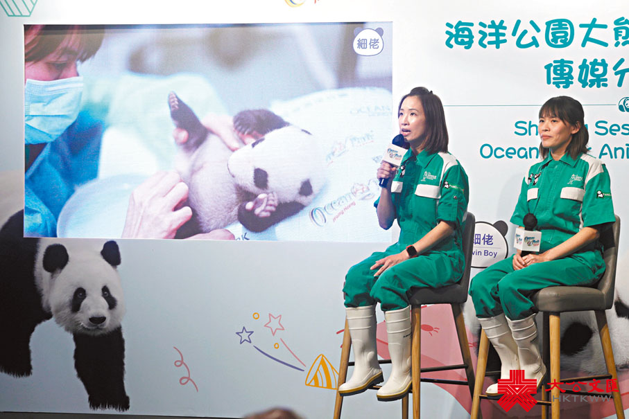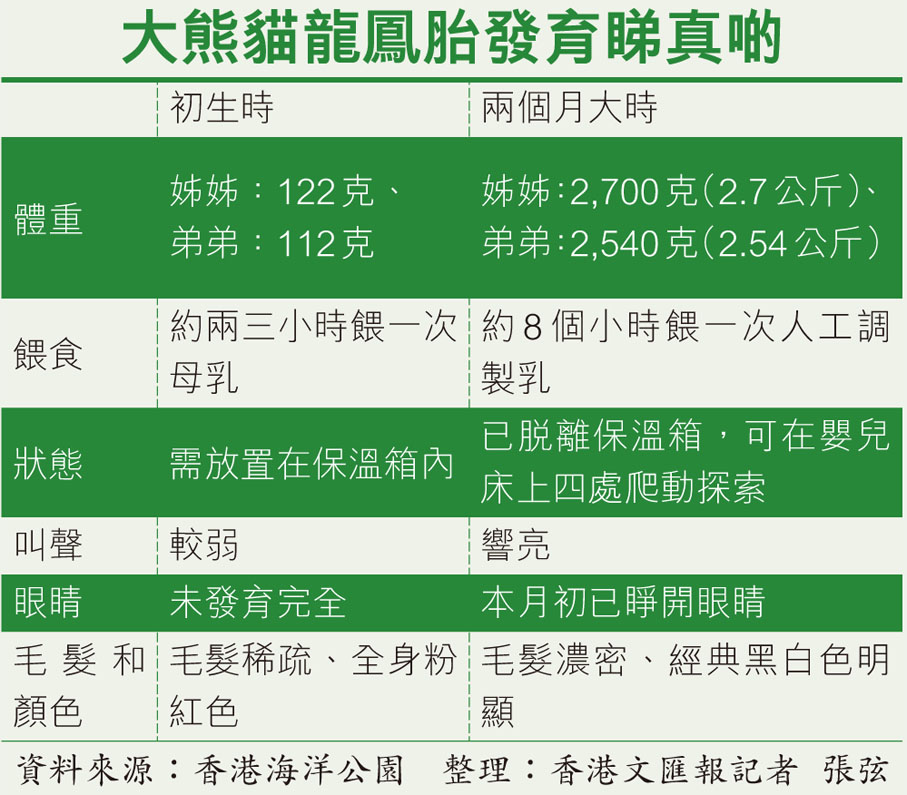 (香港文匯報 記者 張弦)香港海洋公園大熊貓盈盈月前成功誕下一對港產大熊貓龍鳳胎,一對大熊貓寶寶眨眼已經兩個月大。海洋公園動物護理團隊昨日舉行分享會,分享一對寶寶及盈盈的最新狀況及照顧歷程。團隊表示,出生時重122克的姊姊體重已增至2.7公斤,性格溫柔文靜;弟弟亦由出生時重112克增至現時2.54公斤,較具雄性氣概,牠們均已於本月初睜開眼睛。高齡初產孕婦盈盈則需要更多時間恢復,目前已康復70%至80%,護理員形容盈盈母性很強,照顧子女十分專心。海洋公園預計要待牠們長至約6個月大,即明年農曆新年前後始能與公眾見面,但會在此前以錄播甚至直播方式,向公眾播放牠們的生活片段。