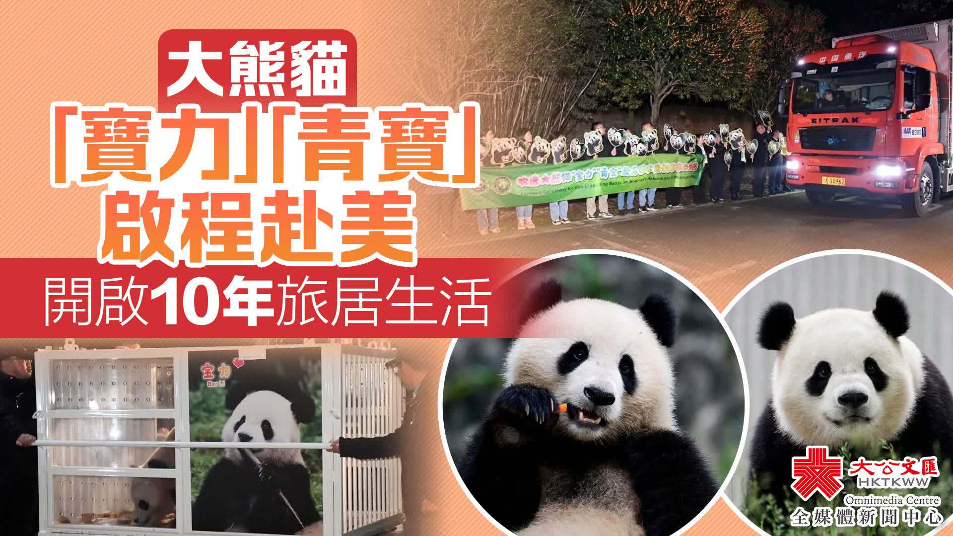 大公文匯全媒體報道,昨晚(14日),兩隻大熊貓「寶力」「青寶」乘坐專車離開中國大熊貓保護研究中心都江堰基地,前往成都雙流國際機場,並將於今日搭乘專機前往美國華盛頓國家動物園,開啟為期10年的旅居生活。