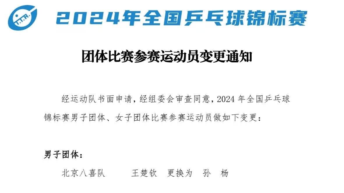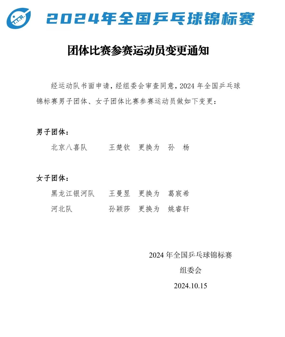 大公文匯網報道,10月15日,2024年全國乒乓球錦標賽組委會發出《團體比賽參賽運動員變更通知》,通知稱,經運動員書面申請,經組委會審查同意,2024年全國乒乓球錦標賽男子團體、女子團體比賽參賽運動員進行了如下變更: