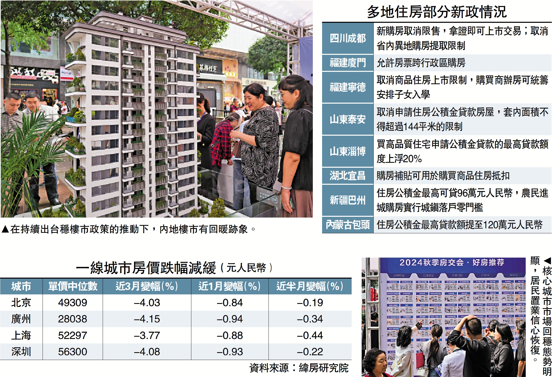 國慶長假期間樓市延續向好態勢,北京二手房單日成交破2000宗,創新高;上海本月13日二手房網簽逾千套;深圳本月1日至13日的新房認購量等同過往兩個月的網簽;廣州9月30日至10月12日,一手住宅認購量6687宗,按年增逾兩倍。專家認為,在一攬子利好政策引導下,消費者市場預期已經發生轉變,料10月市場銷售將出現明顯增長。