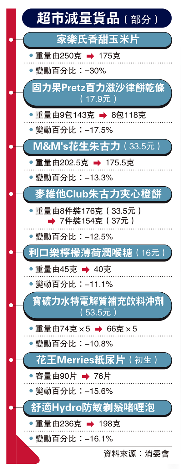 (大公報 記者 鍾佩欣)全球通脹下,超市部分貨品售價不變,但容量或重量「縮水」。消費者委員會昨日公布調查發現,抽取超市的62件貨品中,九成貨品有減量,尤以食品類最多,25件貨品容量或重量減少10%以上,最普遍為糖果、餅乾及零食。其中「家樂氏香甜玉米片」的重量減少三成、「固力果百力滋沙律餅乾條」的重量減少17.5%,另有三件貨品在不足三年期間的容量及重量減完再減。