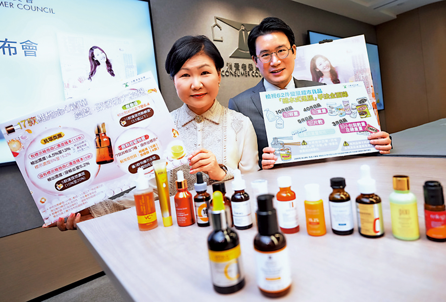 維他命C是近年護膚品的常見有效成分之一。消委會測試17款精華液美容液維他命C,10款的測試結果均低於標示濃度,其中韓國品牌「MISSHA」樣本沒有檢出維他命C,同時檢出兩種致敏香料;另有四款樣本總評為五星,其中加拿大品牌「The Ordinary」30毫升,售價為101元,性價比最高。