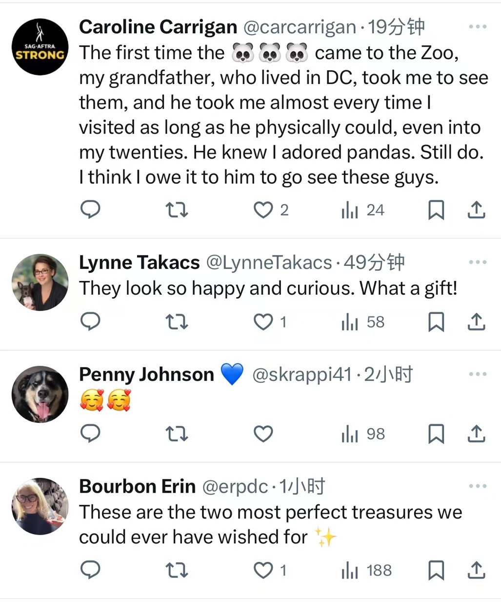 美國民眾留言表示,「這是我們一直夢寐以求的兩隻寶貝!」「這真是一份美好的禮物!」還有網友表示大熊貓承載了自己幼時回憶,他提到,小時候自己的外公經常帶自己去看大熊貓,即使已經到了20多歲,外公知道自己喜歡大熊貓,也還是會帶自己去。如今「寶力」「青寶」來到華盛頓,他表示「這次輪到我帶外公去看大熊貓了」。