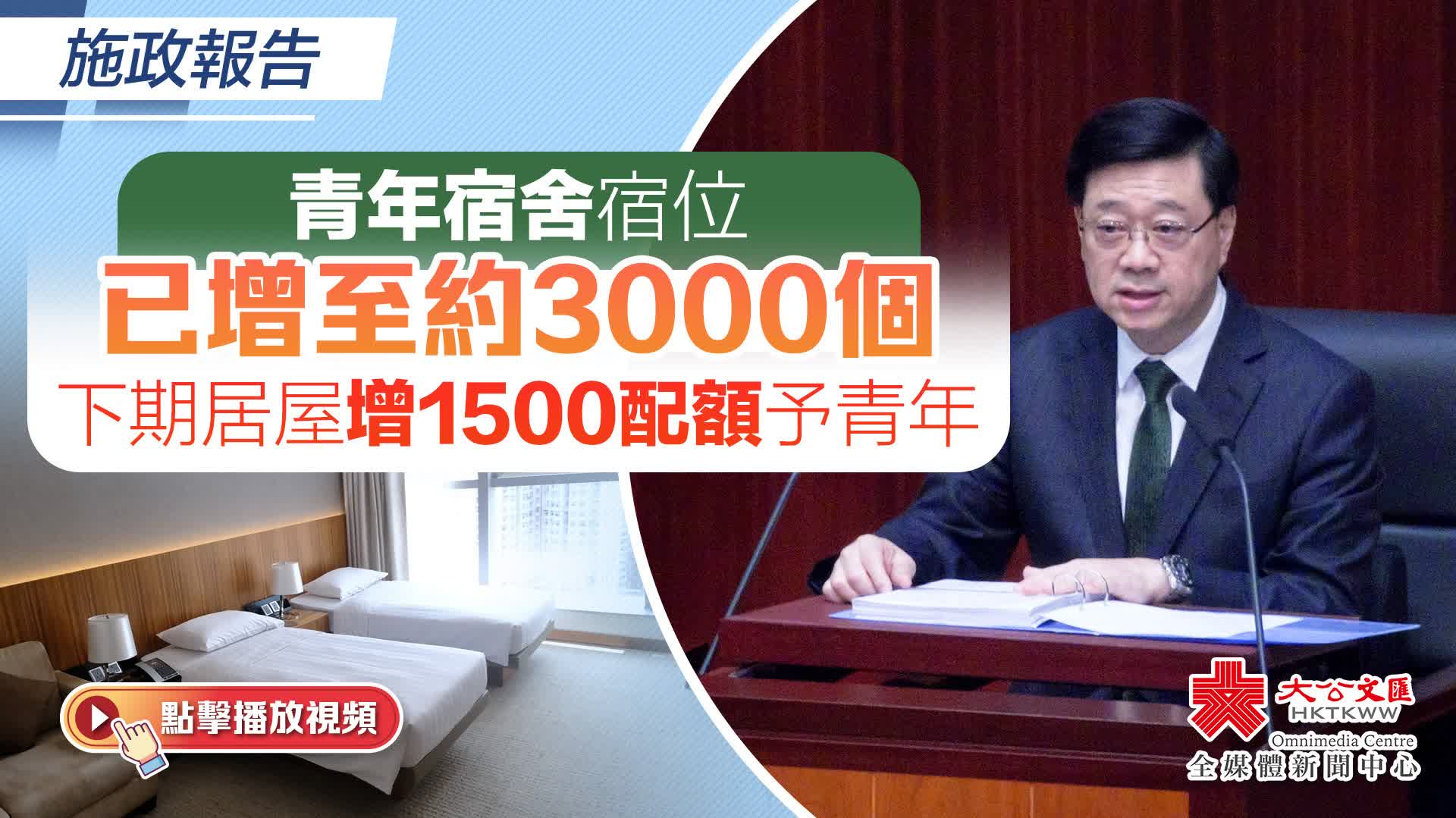 李家超表示,為回應青年對擁有自住空間的期望,政府推出青年宿舍計劃,並在兩年前擴大計劃,資助非政府機構租用合適酒店和旅館轉作青年宿舍。當局更成立了專責小組,提供針對性支援和技術建議,包括協助他們與酒店業主商議,盡早達成協議。現時宿位數目已增加到約3000個。