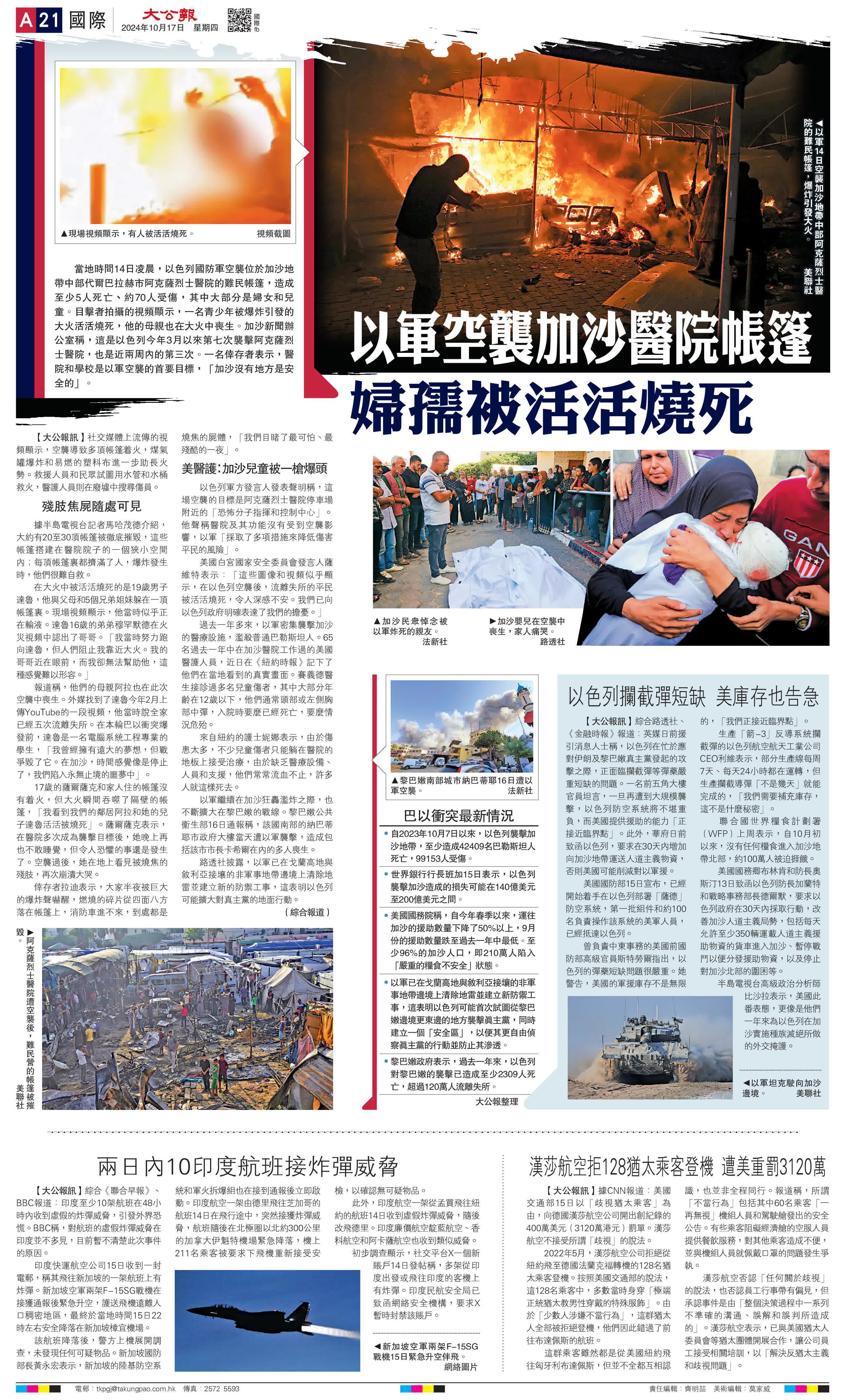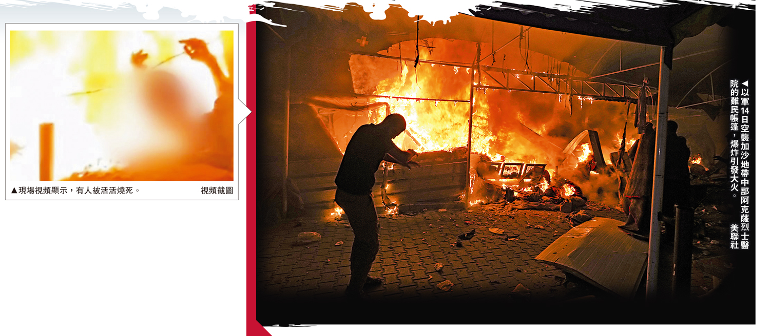 大公報綜合報道,當地時間14日凌晨,以色列國防軍空襲位於加沙地帶中部代爾巴拉赫市阿克薩烈士醫院的難民帳篷,造成至少5人死亡、約70人受傷,其中大部分是婦女和兒童。目擊者拍攝的視頻顯示,一名青少年被爆炸引發的大火活活燒死,他的母親也在大火中喪生。加沙新聞辦公室稱,這是以色列今年3月以來第七次襲擊阿克薩烈士醫院,也是近兩周內的第三次。一名倖存者表示,醫院和學校是以軍空襲的首要目標,「加沙沒有地方是安全的」。