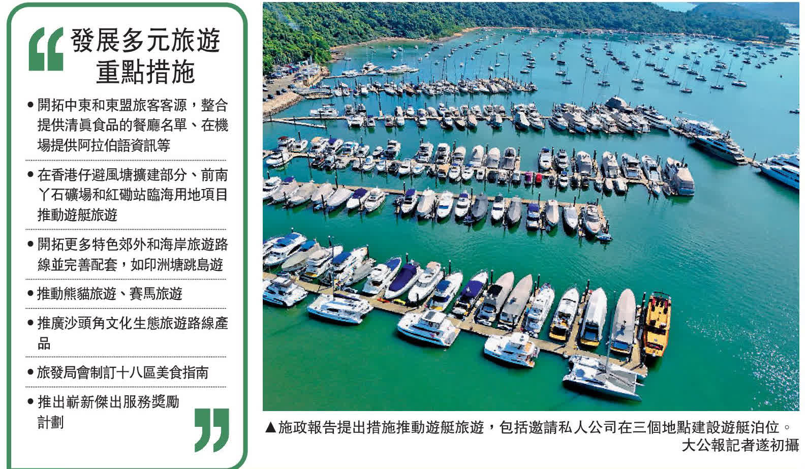 (大公報記者 易曉彤 賴振雄)行政長官李家超在新一份施政報告提到,要做到「香港無處不旅遊」,需以創新思維打造香港成為首選旅遊目的地。文化體育及旅遊局今年內將公布《香港旅遊業發展藍圖2.0》,重點涵蓋推動文化、體育、生態及盛事等方向。政府將推出多項措施吸引高消費旅客,包括邀請私人機構在紅磡、香港仔避風塘、南丫島建設和營運遊艇泊位,以推動遊艇旅遊;鼓勵社會各界提升穆斯林友善設施,例如提供阿拉伯語資訊等,幫助開拓中東和東盟旅客客源。