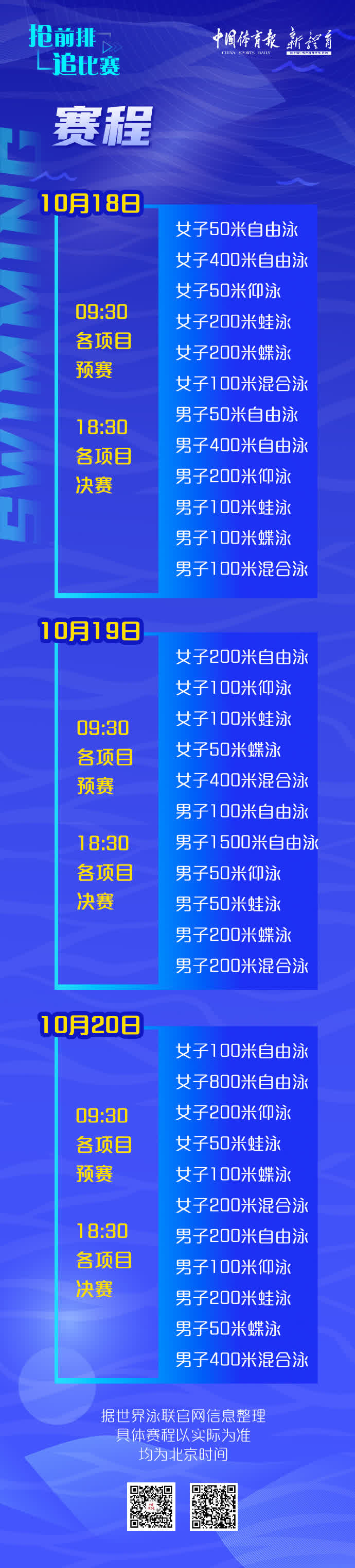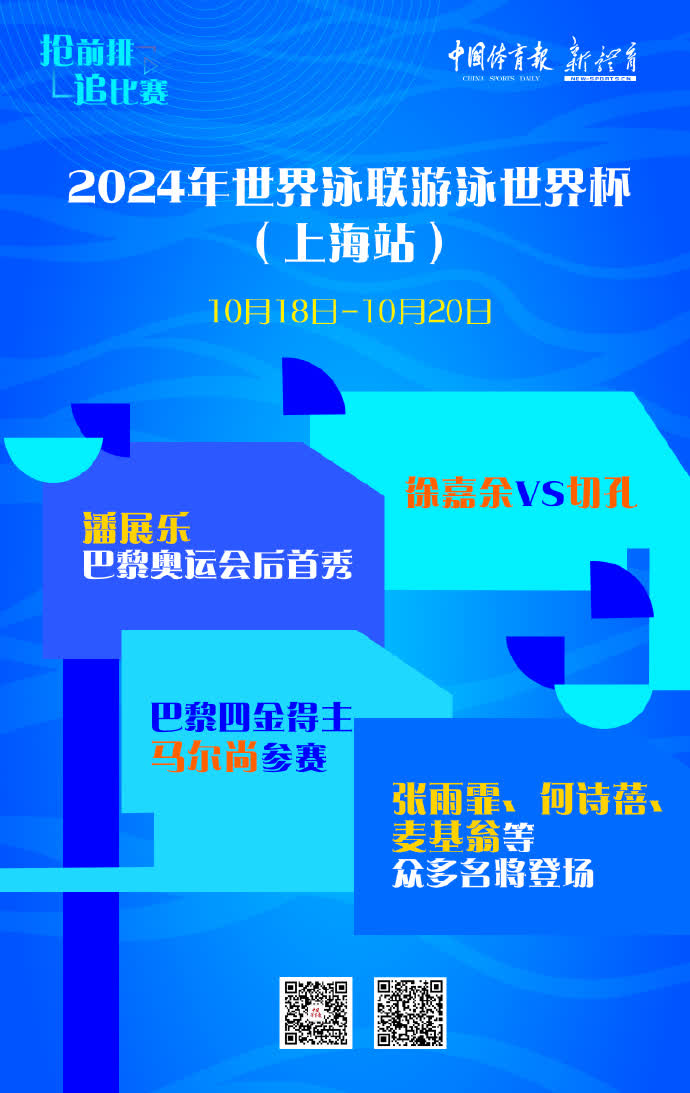 大公文匯網報道,2024年世界泳聯游泳世界盃上海站將於明日至本月20日在東方體育中心游泳館「玉蘭橋」舉行,賽事為25米短池,200餘名運動員將在全部34個個人項目(男女各17個)中展開激烈角逐。本次賽事匯集了19名奧運冠軍,其中中國游泳隊將派出巴黎奧運會全陣容集體參賽,包括潘展樂、張雨霏、唐錢婷、葉詩文等在內的明星選手都將參加。國際頂尖運動員同樣星光熠熠,巴黎奧運會「四金王」馬爾尚,巴黎奧運會女子100米、200米仰泳冠軍麥基翁,巴黎奧運會男子100米仰泳冠軍切孔等8位奧運冠軍都將參賽。2024年多哈世錦賽200米自由泳冠軍何詩蓓也將代表中國香港亮相上海站賽事!