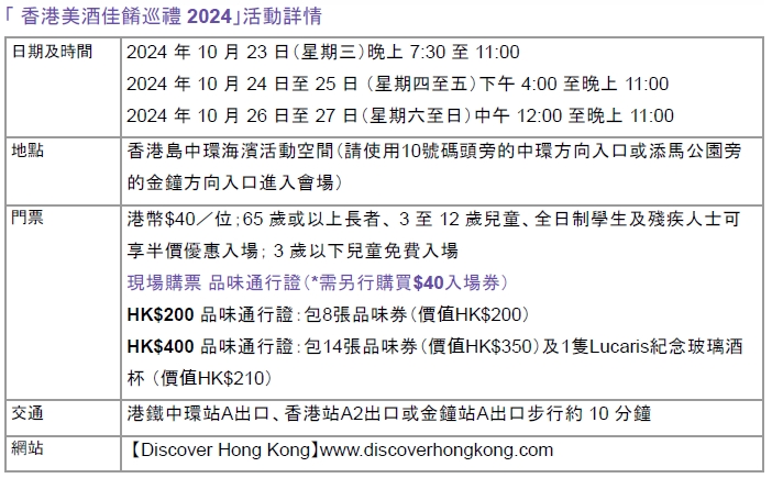 大公文匯全媒體報道,由旅發局主辦的年度盛事「香港美酒佳餚巡禮」將於10月23日至10月27日在中環海濱活動空間盛大舉行。今年的「香港美酒佳餚巡禮」規模擴大至超過300個攤位,同場亦加映升級版「品味學堂」,以19個精彩主題工作坊讓參加者踏上一段認識美食與美酒的奇妙旅程。