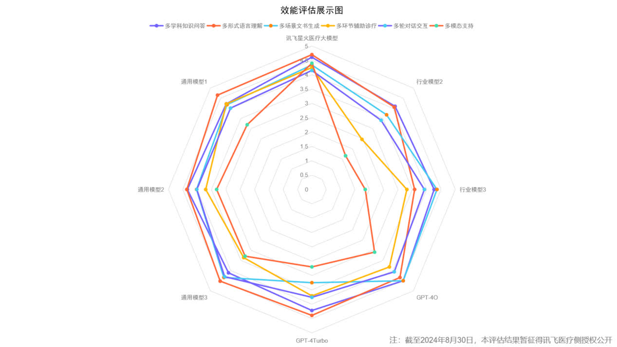 中國信通院近期對GPT-4Turbo、GPT-4O等國際通用大模型,以及文心一言、通義千問、混元和智譜清言ChatGLM等國內通用大模型,還有靈醫Bot、夸克健康助手、訊飛星火醫療大模型和華佗GPT II等醫療健康行業大模型進行效能評估。訊飛星火醫療大模型在評估中表現出色,在個人畫像、健康干預方案、病歷文書生成及質控、檢驗檢查報告解讀、體檢報告單解讀、藥盒解讀等細分任務中都具引領優勢;在健康常識、疾病百科、用藥知識、電子病歷結構化、專業知識生活化、考試輔助智能化、導醫導診便民化、輔助首診及推薦檢驗檢查、輔助確診、用藥安全指導等方向上,也兼具專業性。