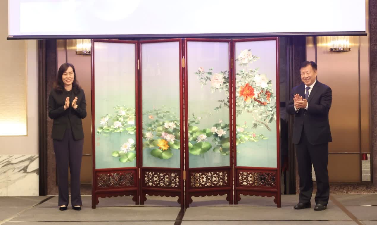 開幕式上,蘇州刺繡研究所製作的雙面繡屏風《唯有牡丹真國色,盛世蓮開繡華章》贈送給澳門特區政府。方偉、歐陽瑜共同揭開蓋在屏風上面的紅布,在場嘉賓見證了這一激動人心的時刻。