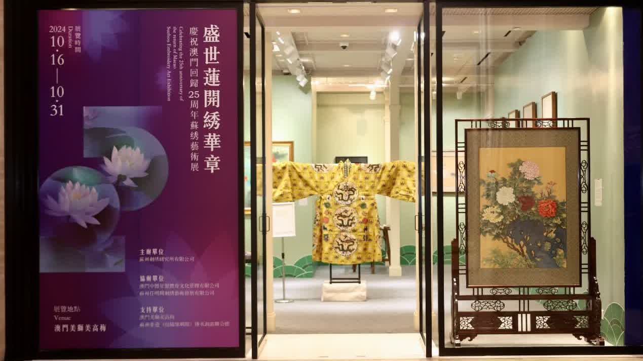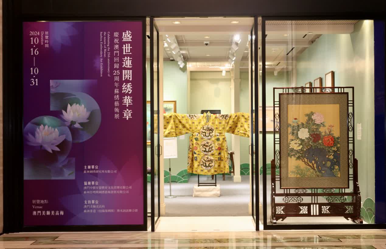 據了解,首次面向社會公眾的《唯有牡丹真國色,盛世蓮開耀濠江》是蘇州刺繡研究所特意為慶祝澳門回歸25周年精心設計,由4名刺繡技藝人員耗時10個月繡制完成。該作品橫2.5米、豎1.999米,象徵澳門回歸25周年及1999年回歸祖國這一重大歷史時刻。作品運用散套、施套、虛實等十餘種傳統細繡針法,巧妙將牡丹和蓮花完美結合,同時加入澳門塔、大三巴牌坊等元素,寓意澳門與祖國緊密相連,也寄託對澳門未來發展蒸蒸日上的美好期許。