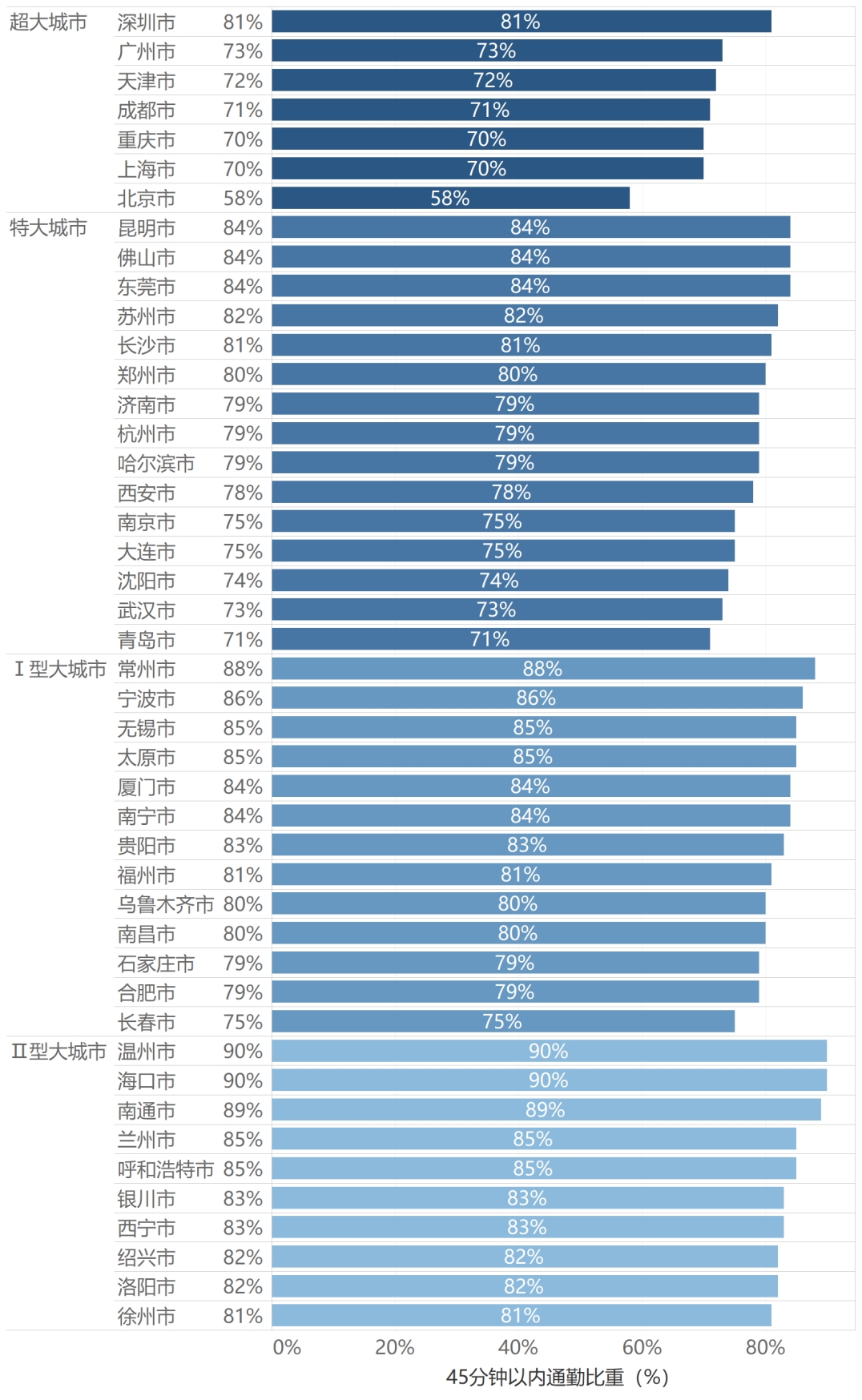 報告指出,2023年,全國層面結束了連續3年幸福通勤全線下降的局面。在45個軌道城市中,有52%的人口實現45分鐘內通勤。一線城市中,深圳45分鐘以內通勤比重81%,同比增加4個百分點,成為首個達到80%目標的超大城市,京廣兩地保持三年同比改善態勢。除北京外,滬穗深均有7成人口單程通勤時間在45分鐘內。