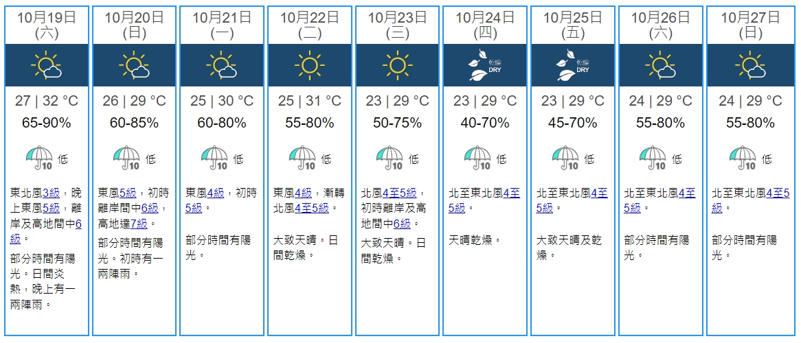 天文台展望明日日間炎熱,晚上風勢逐漸增強,氣溫介乎27至32度,隨後兩三日大致天晴。下周中後期天氣乾燥,早晚稍涼,日夜溫差較大,下周四打鼓嶺早上最低21度。