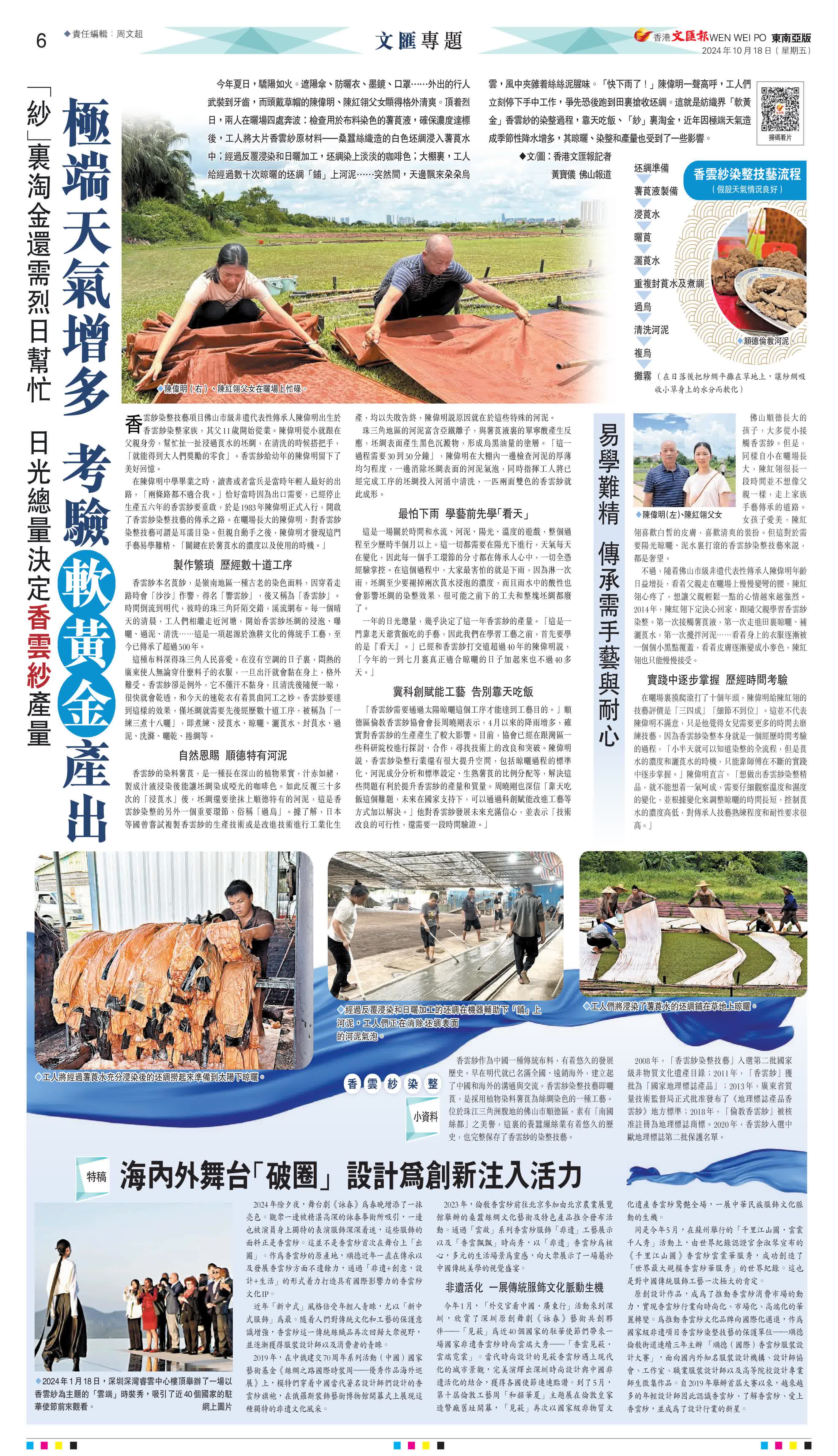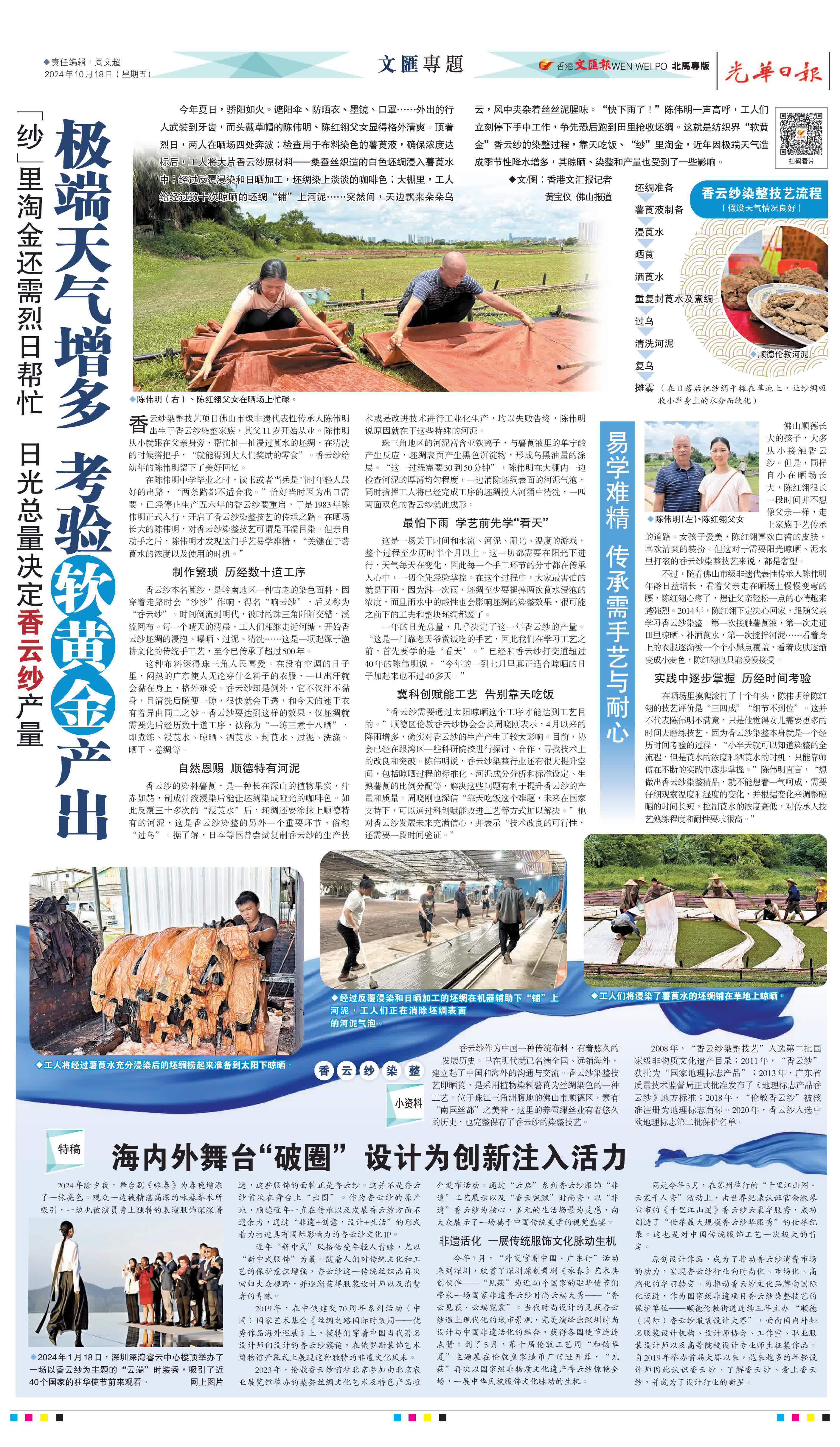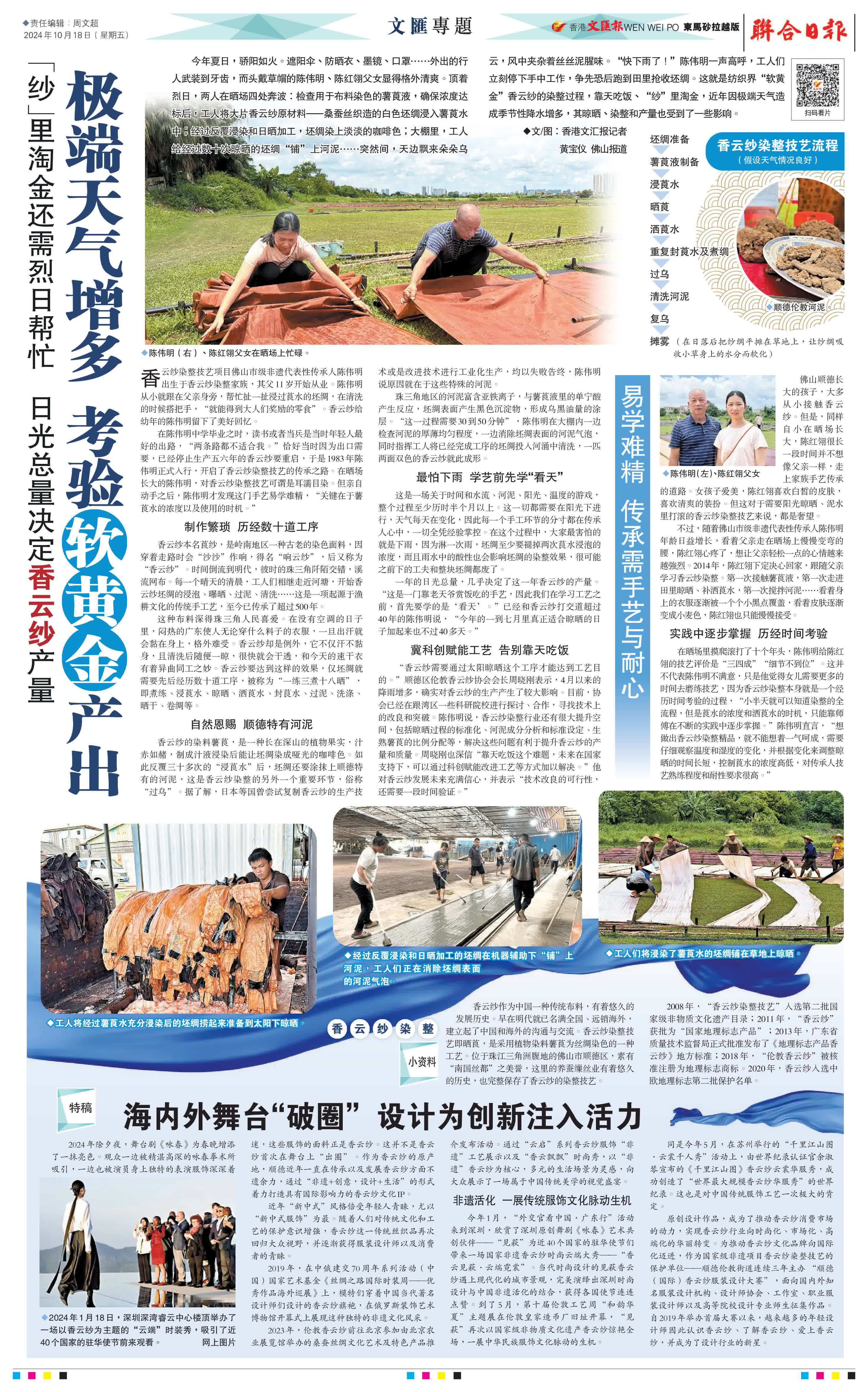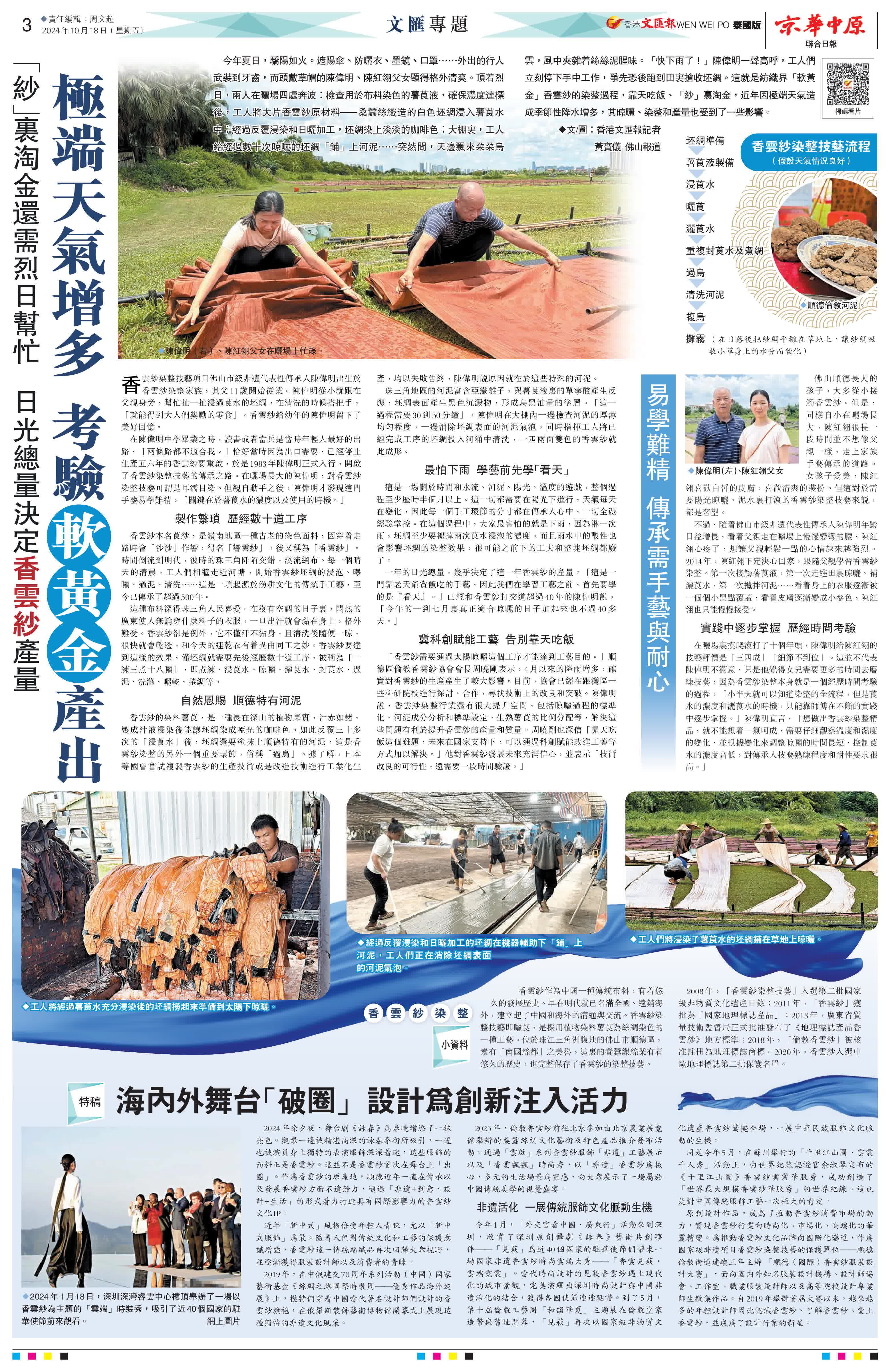 10月18日,《聯合日報》《京華中原》《光華日報》多家海外華媒關注到香雲紗染整技藝項目佛山市級非遺代表性傳承人陳偉明,並對紡織界「軟黃金」香雲紗的染整過程、繁瑣的製作工序、如何受制於天氣以及冀科創賦能工藝改善現狀等內容進行了報道。
