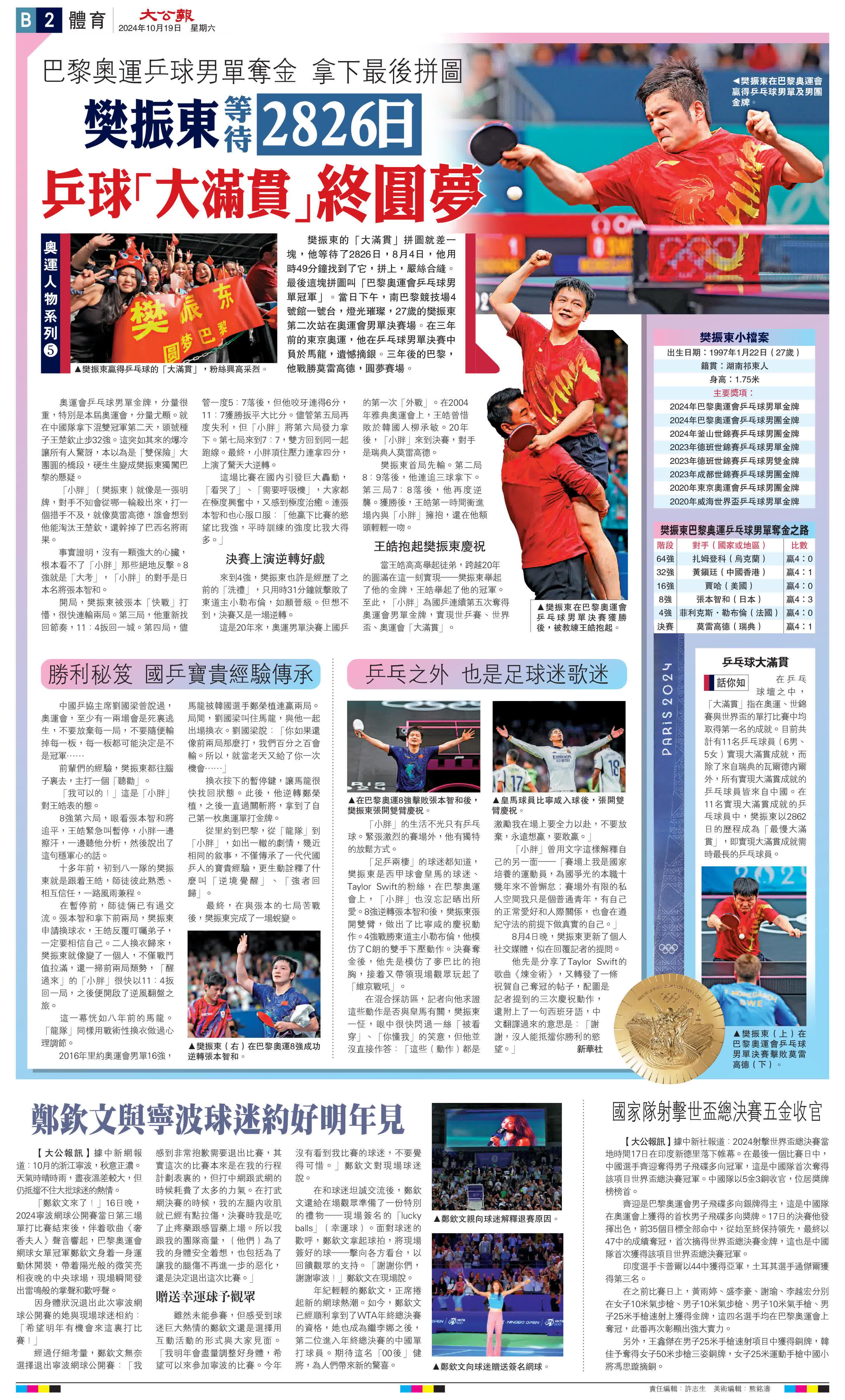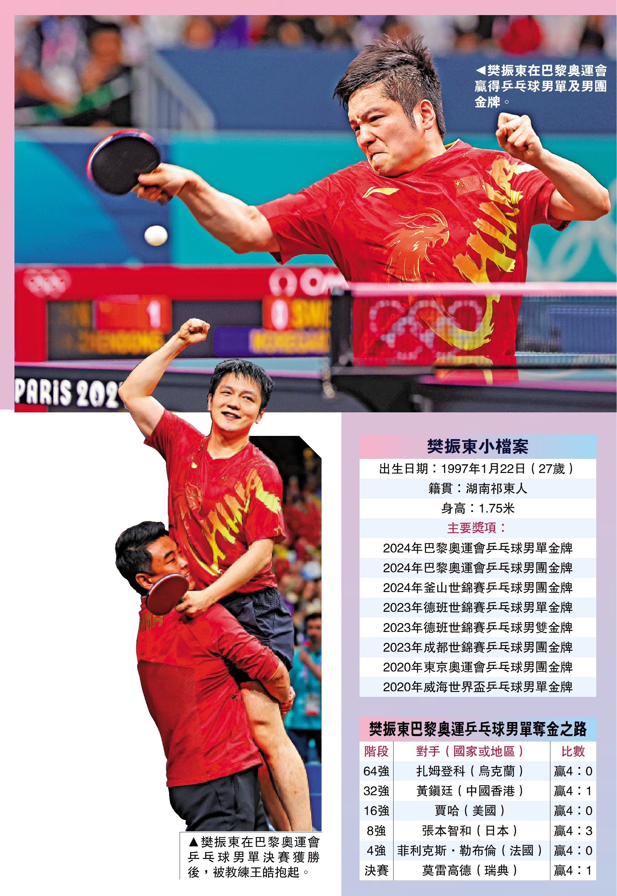 大公報綜合報道,樊振東的「大滿貫」拼圖就差一塊,他等待了2826日,8月4日,他用時49分鐘找到了它,拼上,嚴絲合縫。最後這塊拼圖叫「巴黎奧運會乒乓球男單冠軍」。當日下午,南巴黎競技場4號館一號台,燈光璀璨,27歲的樊振東第二次站在奧運會男單決賽場。在三年前的東京奧運,他在乒乓球男單決賽中負於馬龍,遺憾摘銀。三年後的巴黎,他戰勝莫雷高德,圓夢賽場。