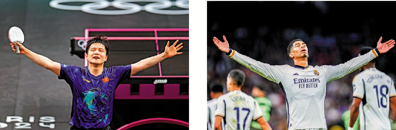 「足乒兩棲」的球迷都知道,樊振東是西甲球會皇馬的球迷、Taylor Swift的粉絲,在巴黎奧運會上,「小胖」也沒忘記晒出所愛。8強逆轉張本智和後,樊振東張開雙臂,做出了比寧咸的慶祝動作。4強戰勝東道主小勒布倫,他模仿了C朗的雙手下壓動作。決賽奪金後,他先是模仿了麥巴比的抱胸,接着又帶領現場觀眾玩起了「維京戰吼」。